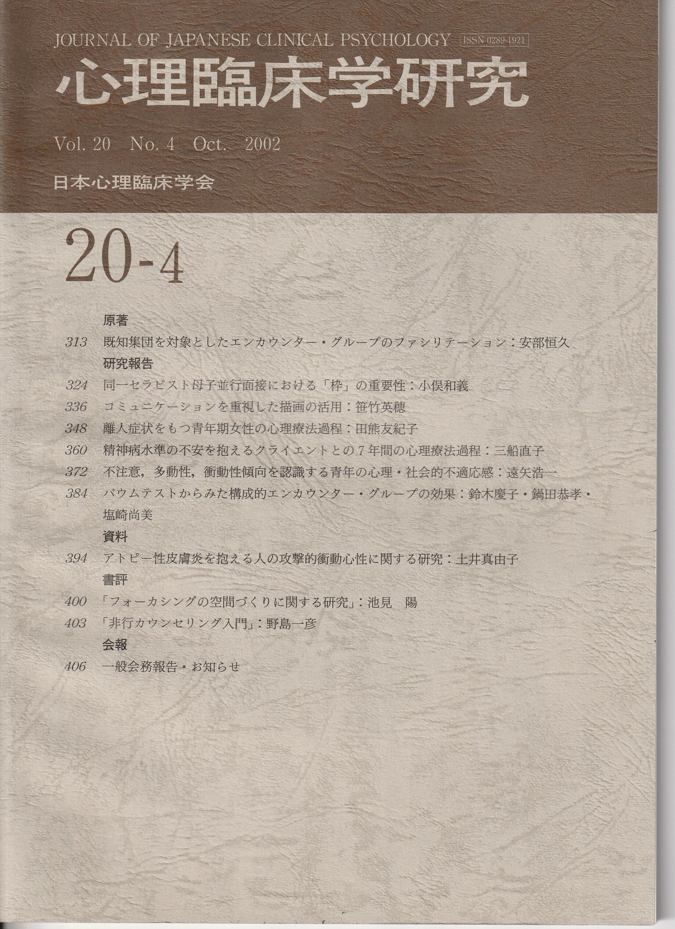 本の紹介:【原著】既知集団を対象としたエンカウンター・グループのファシリテーション【研究報告】同一セラビスト母子並行面接における「枠」の重要性/コミュニケーションを重視した描画の活用/離人症状をもつ青年期女性の心理療法過程/精神病水準の不安を抱えるクライエントとの7年間の心理療法過程/不注意,多動性,衝動性傾向を認識する青年の心理・社会的不適応感/バウムテストからみた構成的エンカウンター・グループの効果【資料】アトピー性皮膚炎を抱える人の攻撃的衝動心性に関する研究【書評】「フォーカシングの空間づくりに関する研究」「非行カウンセリング入門」