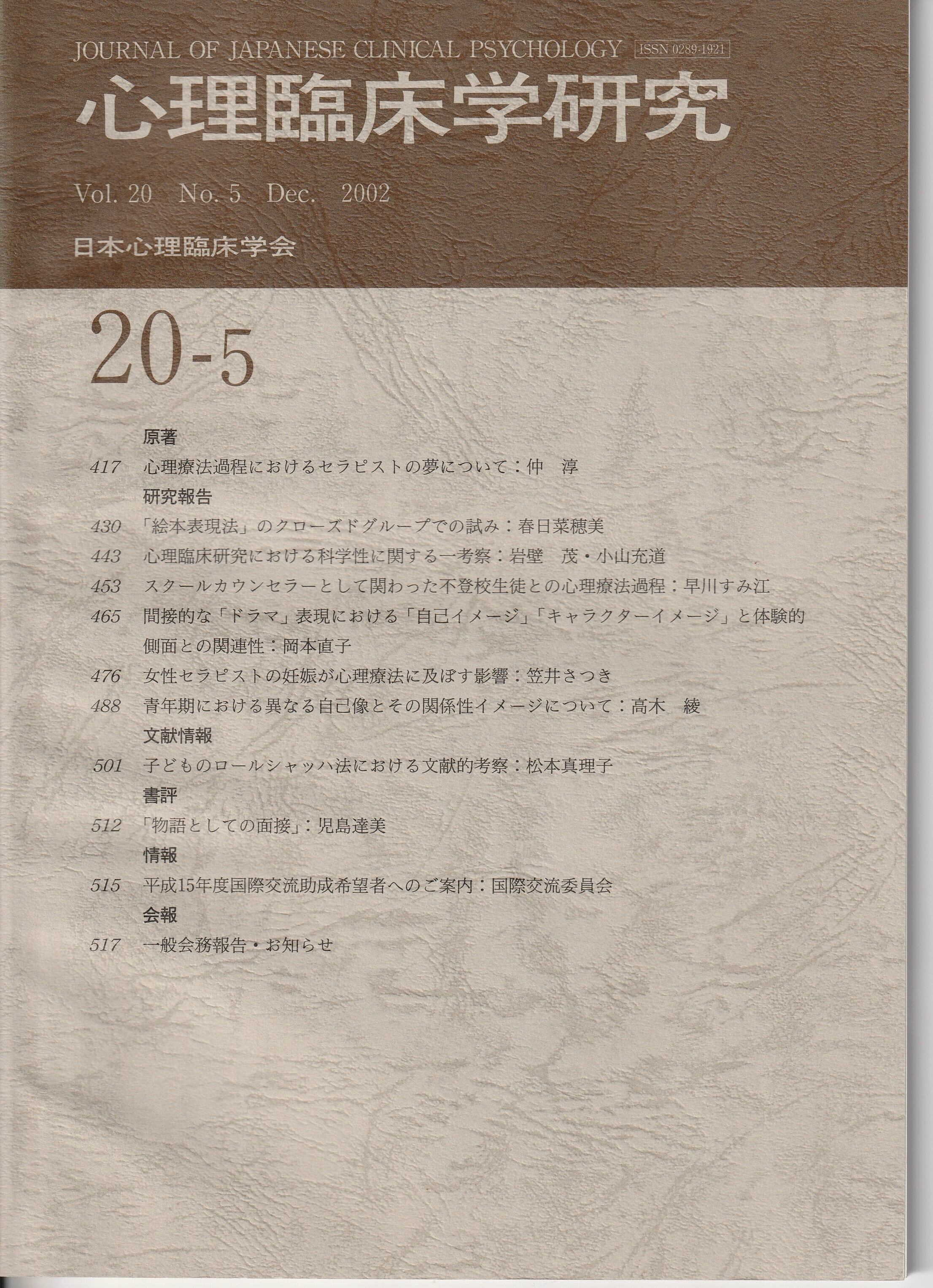 本の紹介:【原著】心理療法過程におけるセラピストの夢について【研究報告】「絵本表現法」のクローズドグループでの試み/心理臨床研究における科学性尼関する一考察/ スクールカウンセラーとして関わった不登校生徒との心理療法過程/間接的な「ドラマ」表現における「自己イメージ」「キャラクターイメージ」と体験的側面との関連性/女性セラピストの妊娠が心理療法に及ぼす影響/青年期における異なる自己像とその関係性イメージについて【文献情報】子どものロールシャッハ法における文献的考察【書評】「物語としての面接」