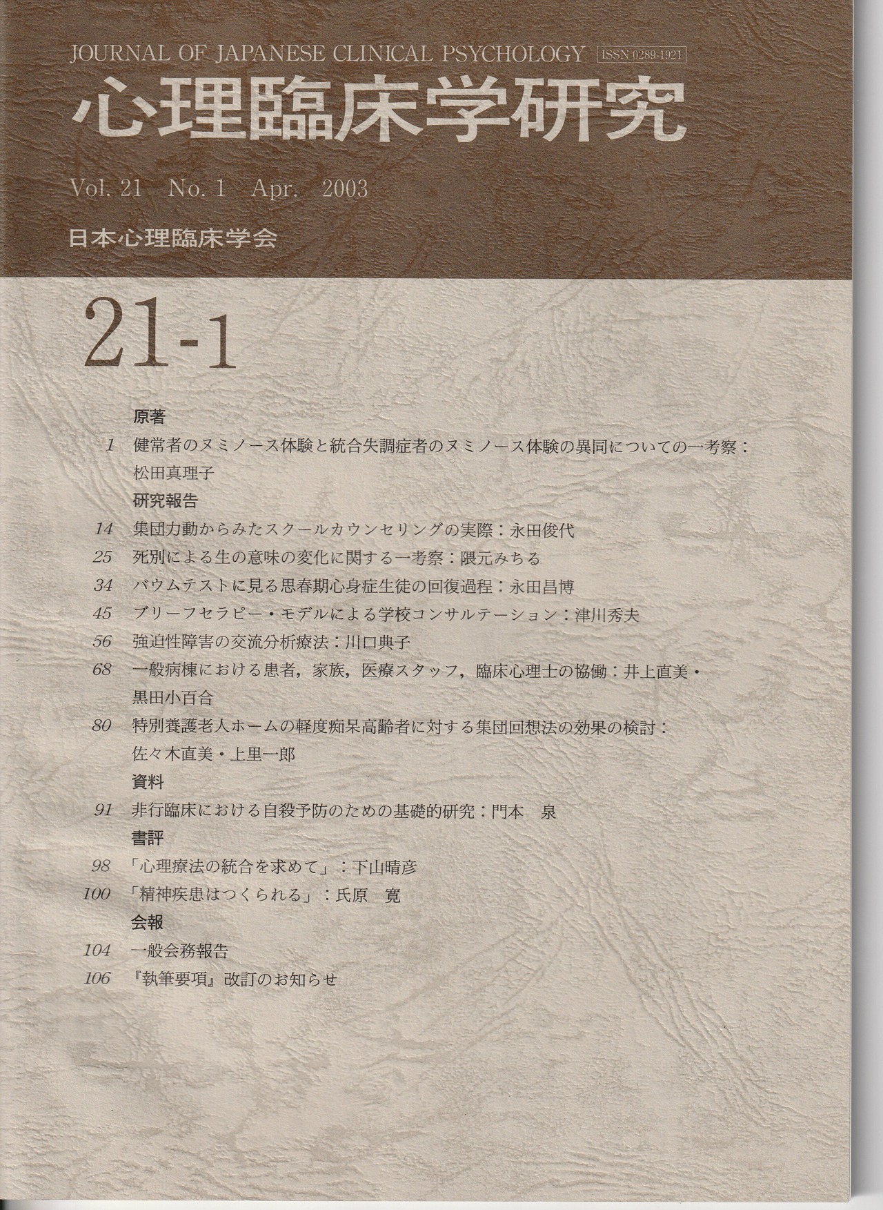 本の紹介:【原著】健常者のヌミノース体験と統合失調症者のヌミノース体験の異同についての一考察 【研究報告】集団力動からみたスクールカウンセリングの実際/死別による生の意味の変化に関する一考察/バウムテストに見る思春期心身症生徒の回復過程/ブリーフセラビー・モデルによる学校コンサルテーション/強迫性障害の交流分析療法/一般病棟における患者,家族,医療スタッフ,臨床心理士の協働/特別養護老人ホームの軽度痴呆高齢者に対する集団回想法の効果の検討【資料】非行臨床における自殺予防のための基礎的研究【書評】「心理療法の統合を求めて」「精神疾患はつくられる」: