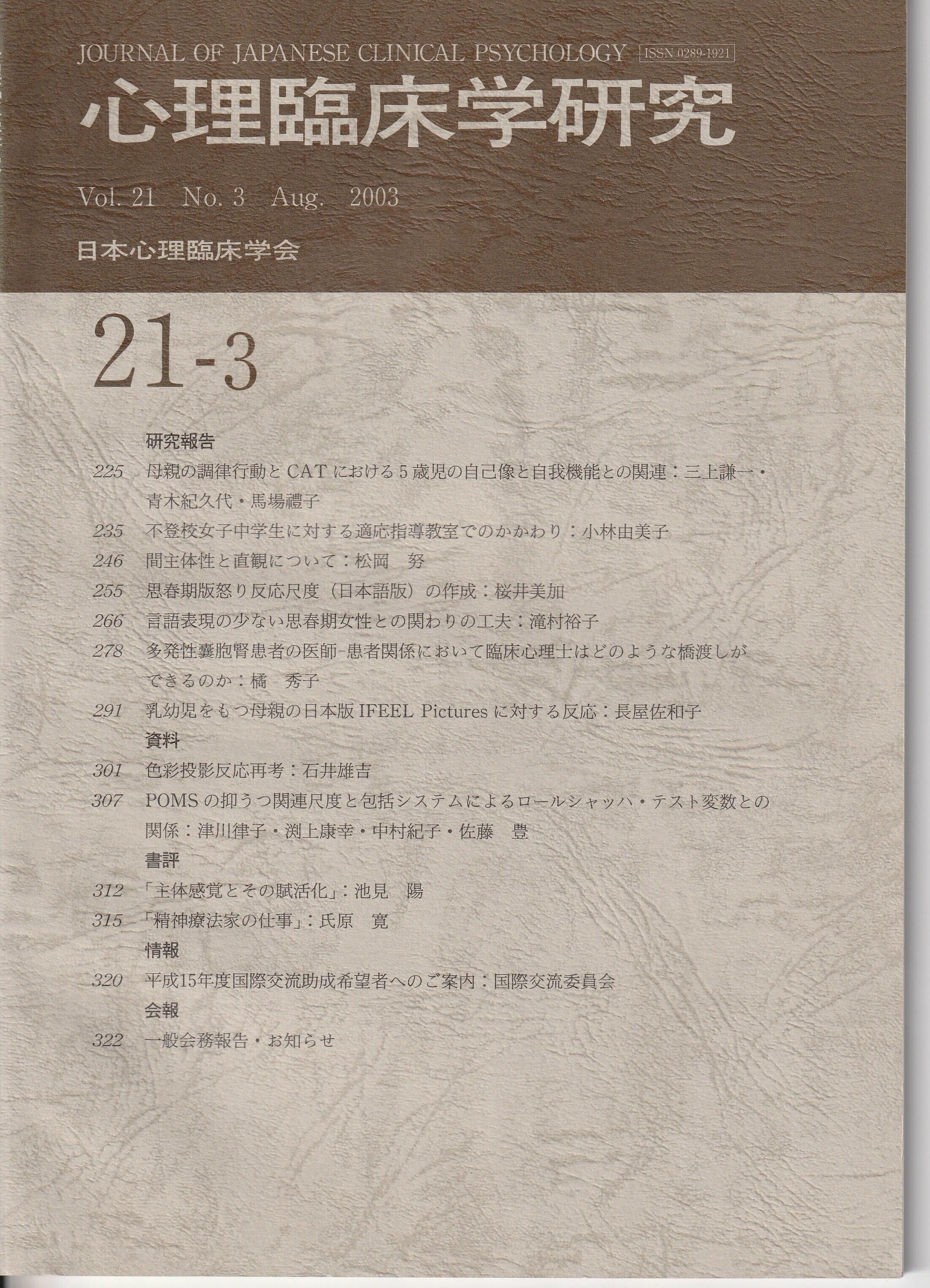 本の紹介:【研究報告】母親の調律行動とCATにおける5歳児の自己像と自我機能との関連/ 不登校女子中学生に対する適応指導教室でのかかわり/間主体性と直観について/思春期版怒り反応尺度(日本語版)の作成/言語表現の少ない思春期女性との関わりの工夫/多発性嚢胞腎患者の医師—患者関係において臨床心理士はどのような橋渡しができるのか/乳幼児をもつ母親の日本版IFEEL Picturesに対する反応【資料】色彩投影反応再考/POMSの抑うつ関連尺度と包括システムによるロールシャッハ・テスト変数との関係【書評】「主体感覚とその賦活化」「精神療法家の仕事」