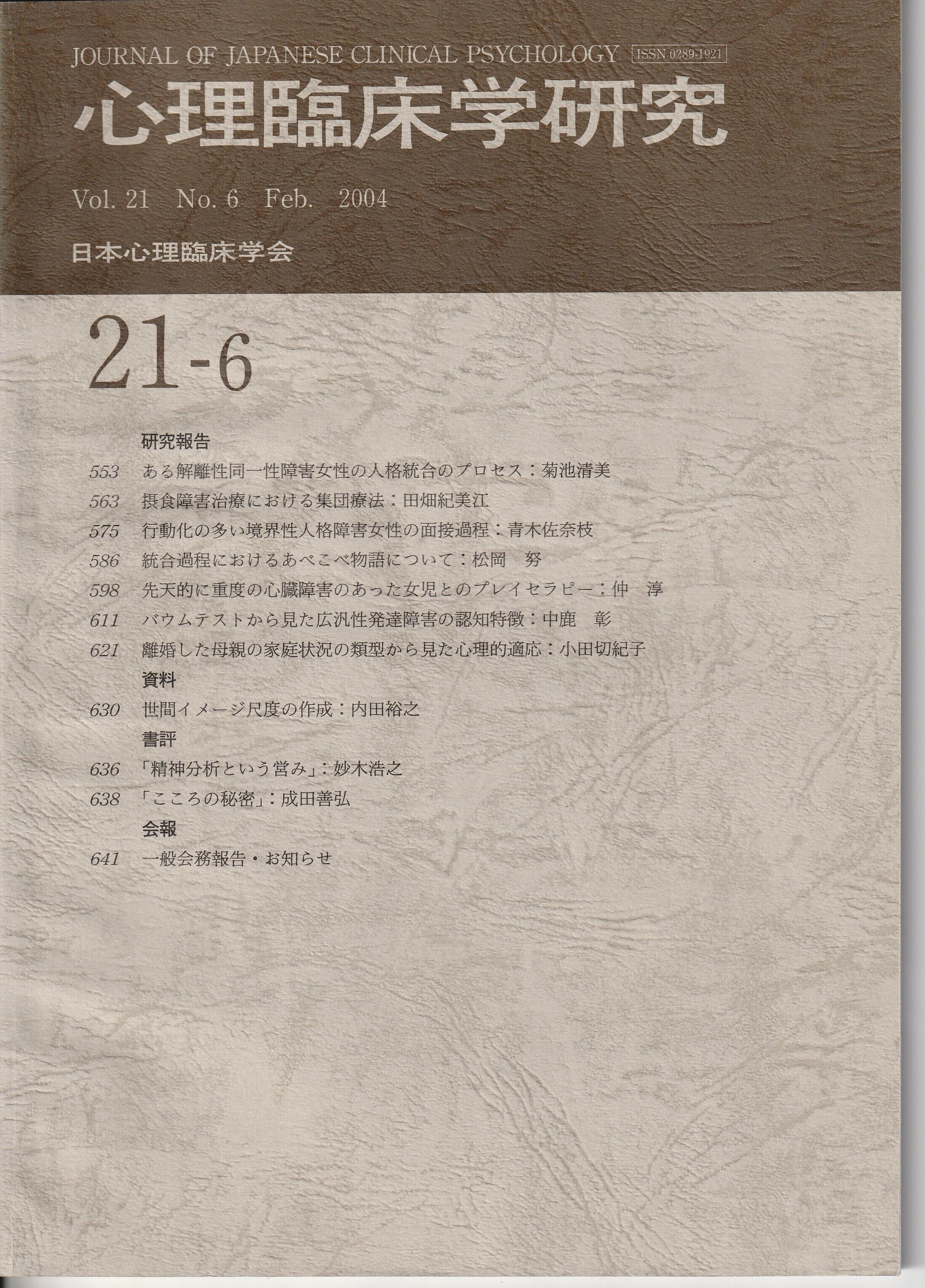 本の紹介:【研究報告】ある解離性同一性障害女性の人格統合のプロセス/摂食障害治療における集団療法/行動化の多い境界性人格障害女性の面接過程/統合過程におけるあべこべ物語について/先天的に重度の心臓障害のあった女児とのプレイセラピー/バウムテストから見た広汎性発達障害の認知特徴/離婚した母親の家庭状況の類型から見た心理的適応【資料】世間イメージ尺度の作成【書評】「精神分析という営み」「こころの秘密」