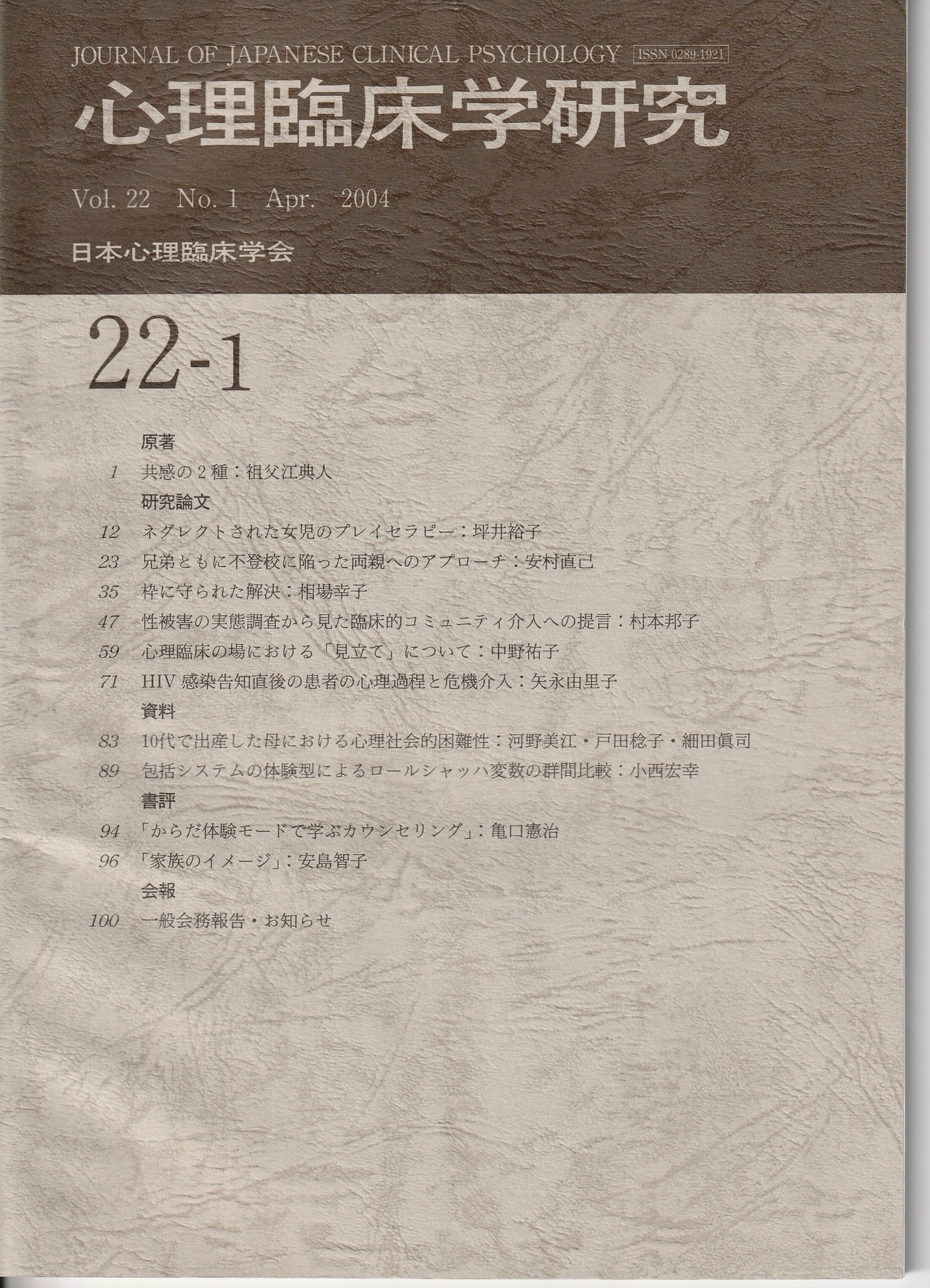 本の紹介:【原著】共感の2種【研究報告】ネグレクトされた女児のプレイセラピー/兄弟ともに不登校に陥った両親へのアプローチ/枠に守られた解決/性被害の実態調査から見た臨床的コミュニティ介入への提言/心理臨床の場における「見立て」について/HIV感染告知直後の患者の心理過程と危機介入【資料】10代で出産した母における心理社会的困難性/包括システムの体験型によるロールシャッハ変数の群間比較【書評】「からだ体験モードで学ぶカウンセリング」「家族のイメージ」