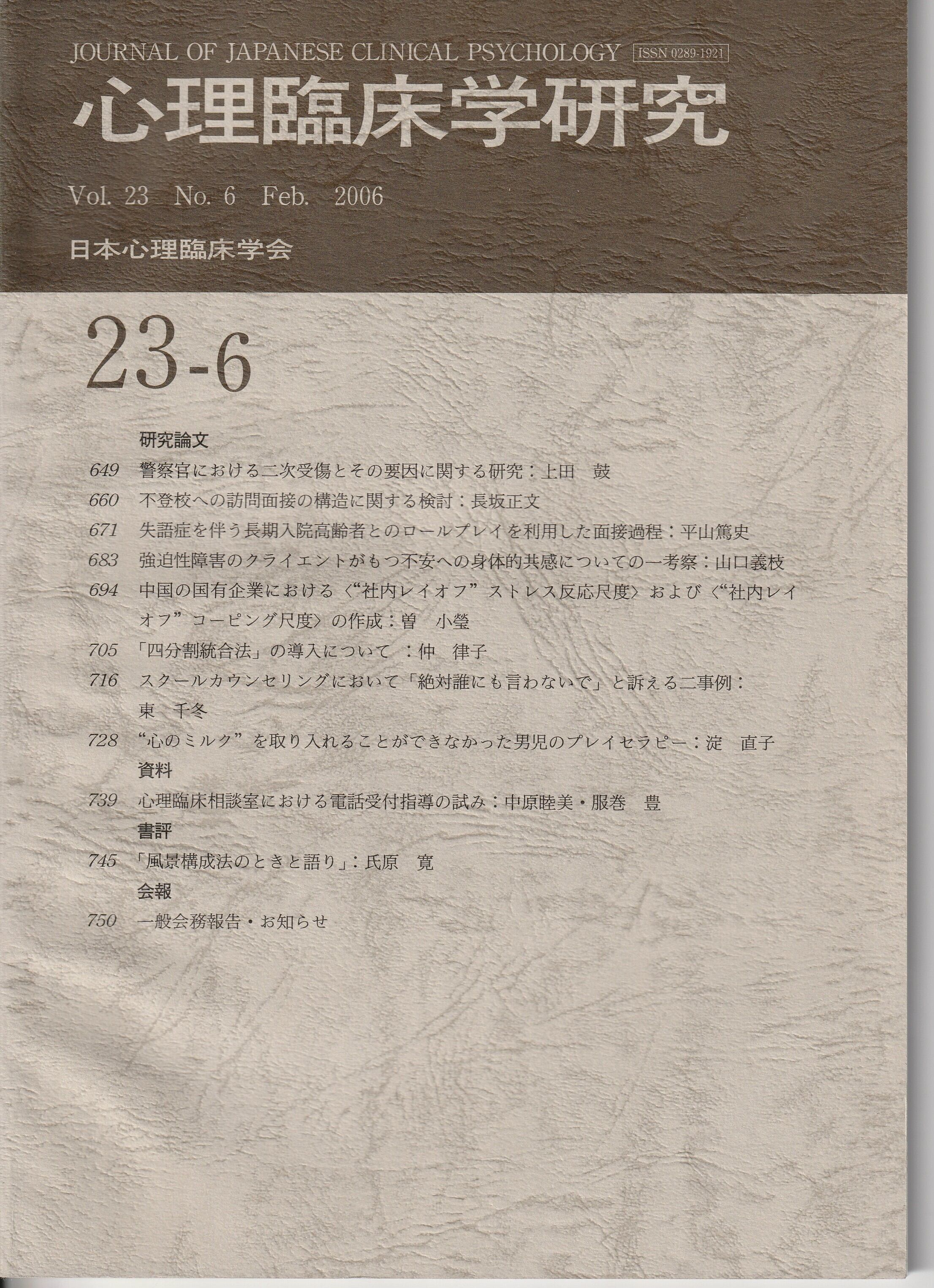 本の紹介:【研究論文】警察官における二次受傷とその要因に関する研究/不登校への訪問面接の構造tこ関する検討/失語症を伴う長期入院高齢者とのロールプレイを利用した面接過程/強迫性障害のクライエントがもつ不安への身体的共感についての一考察/中国の国有企業における〈“社内レイオフ”ストレス反応尺度〉およびく“社内レイオフ”コーピング尺度〉の作成/「四分割統合法」の導入について/スクールカウンセリングにおいて「絶対誰にも言わないで」と訴える二事例/“心のミルク”を取り入れることができなかった男児のプレイセラピー【資料】心理臨床相談室における電話受付指導の試み【書評】「風景構成法のときと語り」