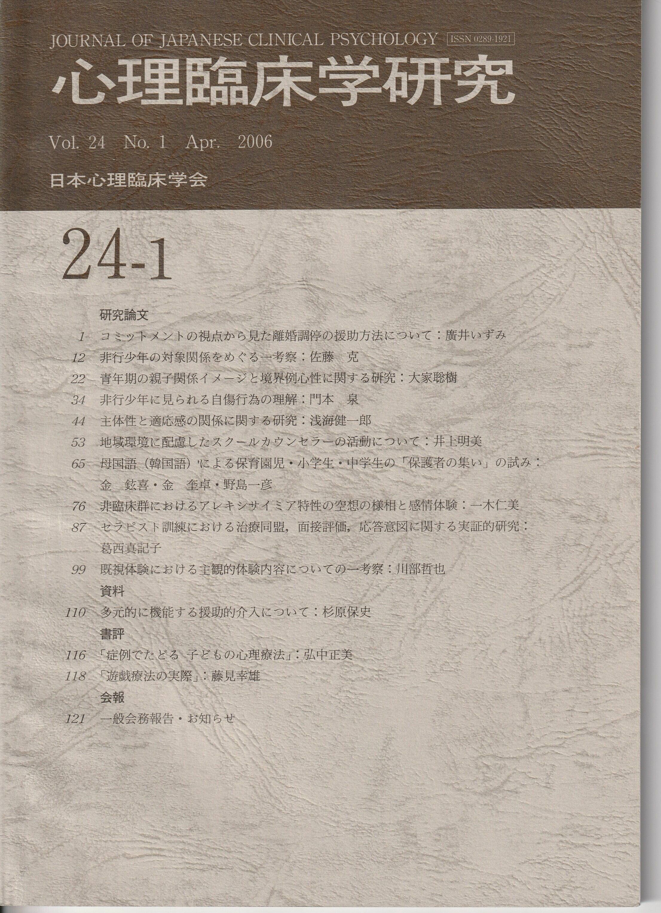 本の紹介:【研究論文】コミットメントの視点から見た離婚調停の援助方法について/非行少年の対象関係をめぐる一考察/ー青年期の親子関係イメージと境界例心性に関する研究/非行少年に見られる自傷行為の理解/主体性と適応感の関係に関する研究/地域環境に配慮したスクールカウンセラーの活量りについて/母国語(韓国語)による保育園児・小学生・中学生の「保護者の集い」の試み/非臨床群におけるアレキシサイミア特性の空想の様相と感情体験/ セラビスト訓練における治療同盟,面接評価ぅ応答意図に関する実証的研究/既視体験における主観的体験内容についての一考察【資料】多元的に機能する援助的介入について【書評】「症例でテこどる子どもの心理療法」 「遊戯療法の実際」