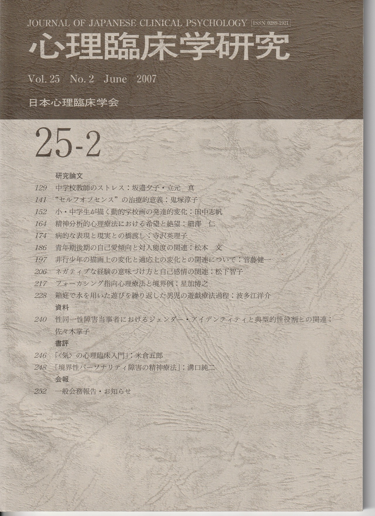 本の紹介:【研究論文】中学校教師のストレス/ “ セルフオフセンス” の治療的意義/小・中学生が描く動的学校画の発達的変化/精神分析的心理療法における希望と絶望/病的な表現と現実との橋渡し/青年期後期の自己愛傾向と対人襲度の関連/非行少年の描画上の変化と適応上の変化との関連について/ネガティブな経験の意味づけ方と自己感情の関連/フォーカシング指向心理療法と境界例/箱庭で水を用いた遊びを繰り返した男児の遊戯療法過程【資料】性同一性障害当事者におけるジェンダー・アイデンテイティと典型的性役割との関連【書評】「く気>の心理臨床入門」「境界性パーソナリティ障害の精神療法」