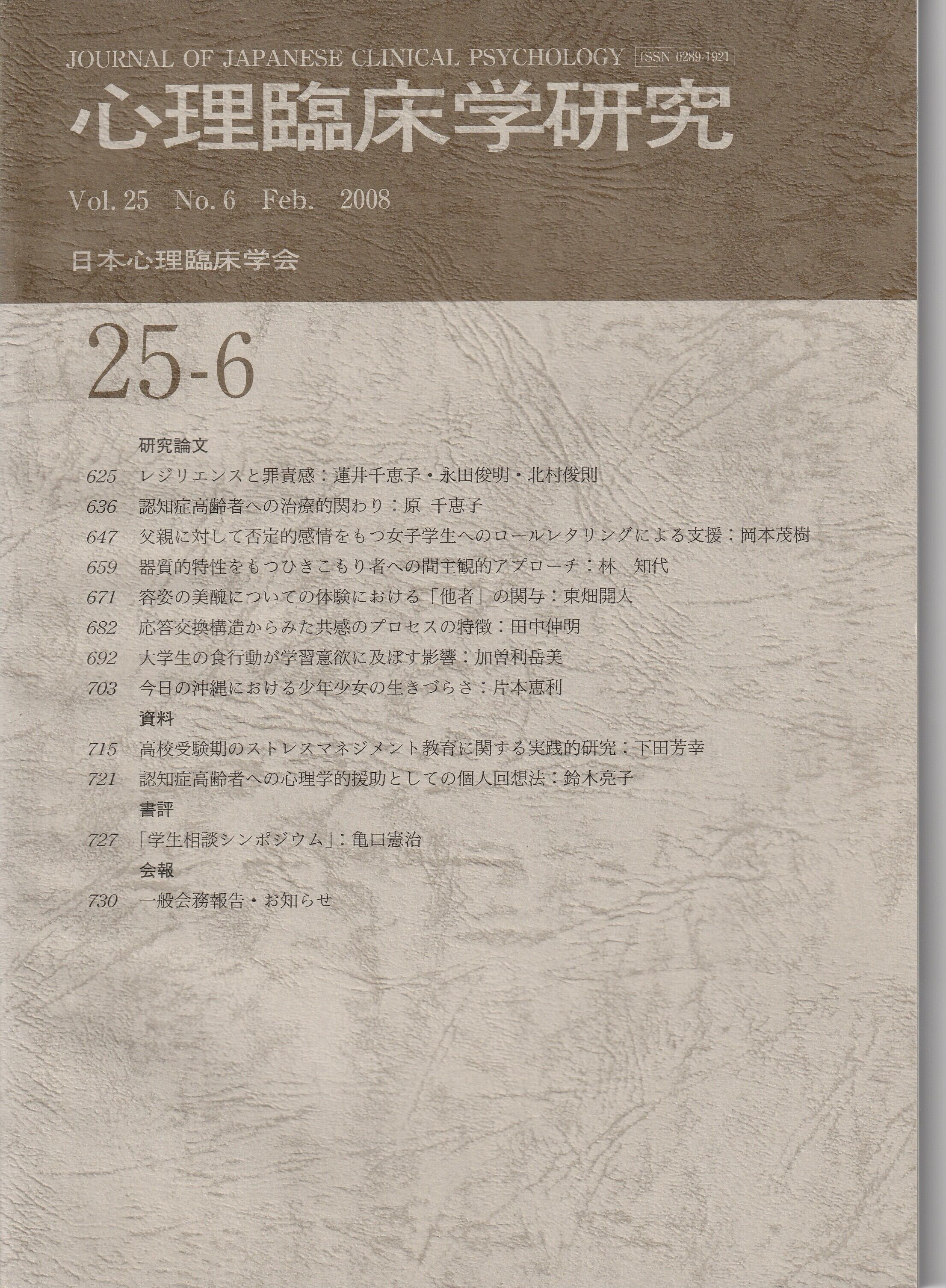 本の紹介:【研究論文】レジリエンスと罪責感/認知症高齢者への治療的関わり/父親に対して否定的感情をもつ女子学生へのロールレタリングによる支援/器質的特性をもつひきこもり者への間主観的アプローチ/容姿の美醜についての体験における「他者」の関与/応答交換構造からみた共感のプロセスの特徴/大学生の食行動が学習意欲に及ぼす影響/今日の沖縄における少年少女の生きづらさ【資料】高校受験期のストレスマネジメント教育に関する実践的研究/認知症高齢者への心理学的援助としての個人回想法【書評】「学生相談シンポジウム」