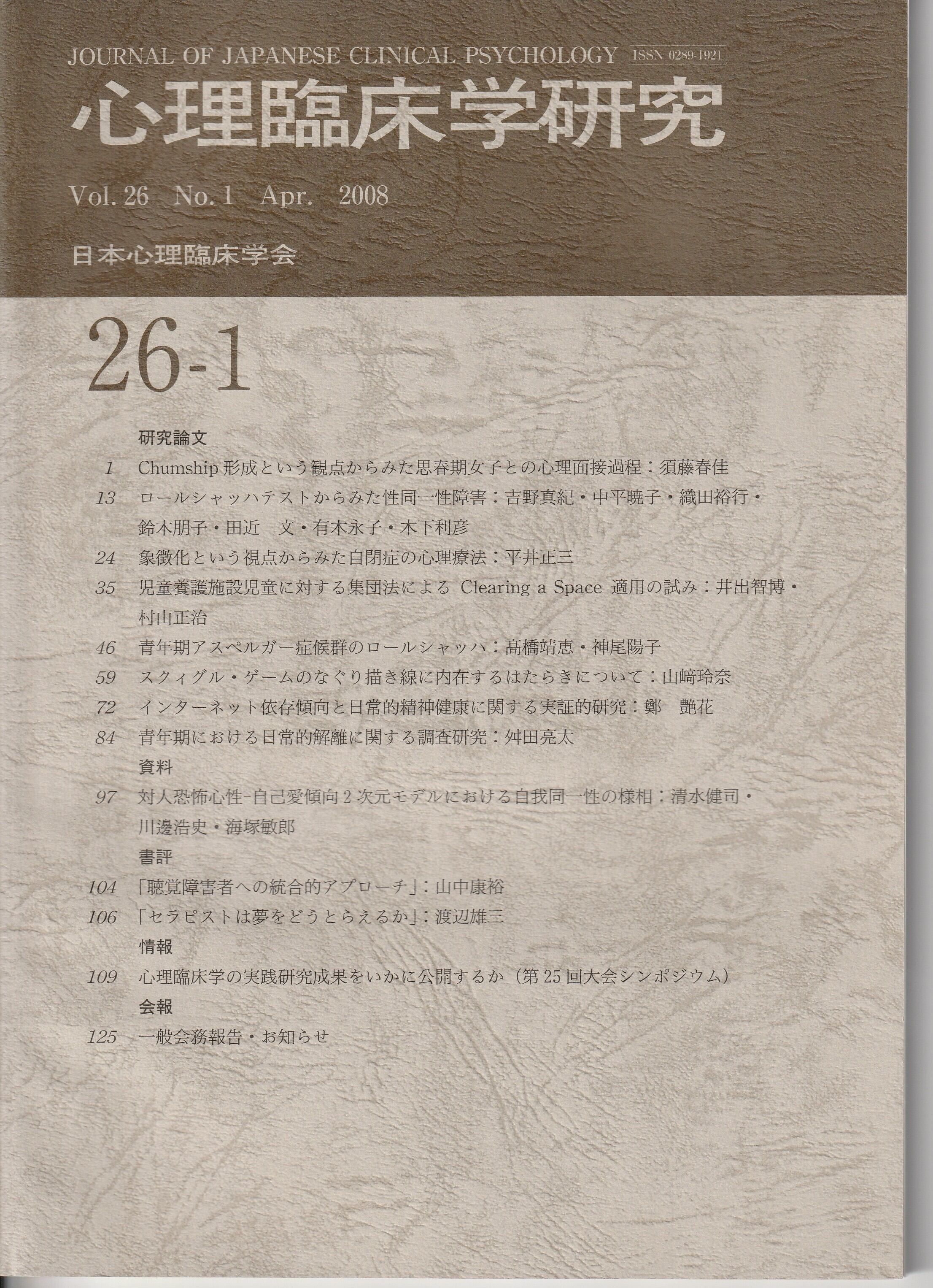 本の紹介:【研究論文】 Chumship形成という観点からみた思春期女子との心理面接過程/ ロールシャッハテストからみた性同一性障害/象徴化という視点からみた自閉症の心理療法/ 児童養護施設児童に対する集団法によるClearing a Space適用の試み/青年期アスペルガー症候群のロールシャッハ/スクイグル・ゲームのなぐり描き線に内在するはたらきについて/インターネット依存傾向と日常的精神健康に関する実証的研究/青年期における日常的解離に関する調査研究【資料】対人恐怖心性ー自己愛傾向2次元モデルにおける自我同一性の様相【書評】 「聴覚障害者への統合的アプローチ]「セラピストは夢をどうとらえるかJ