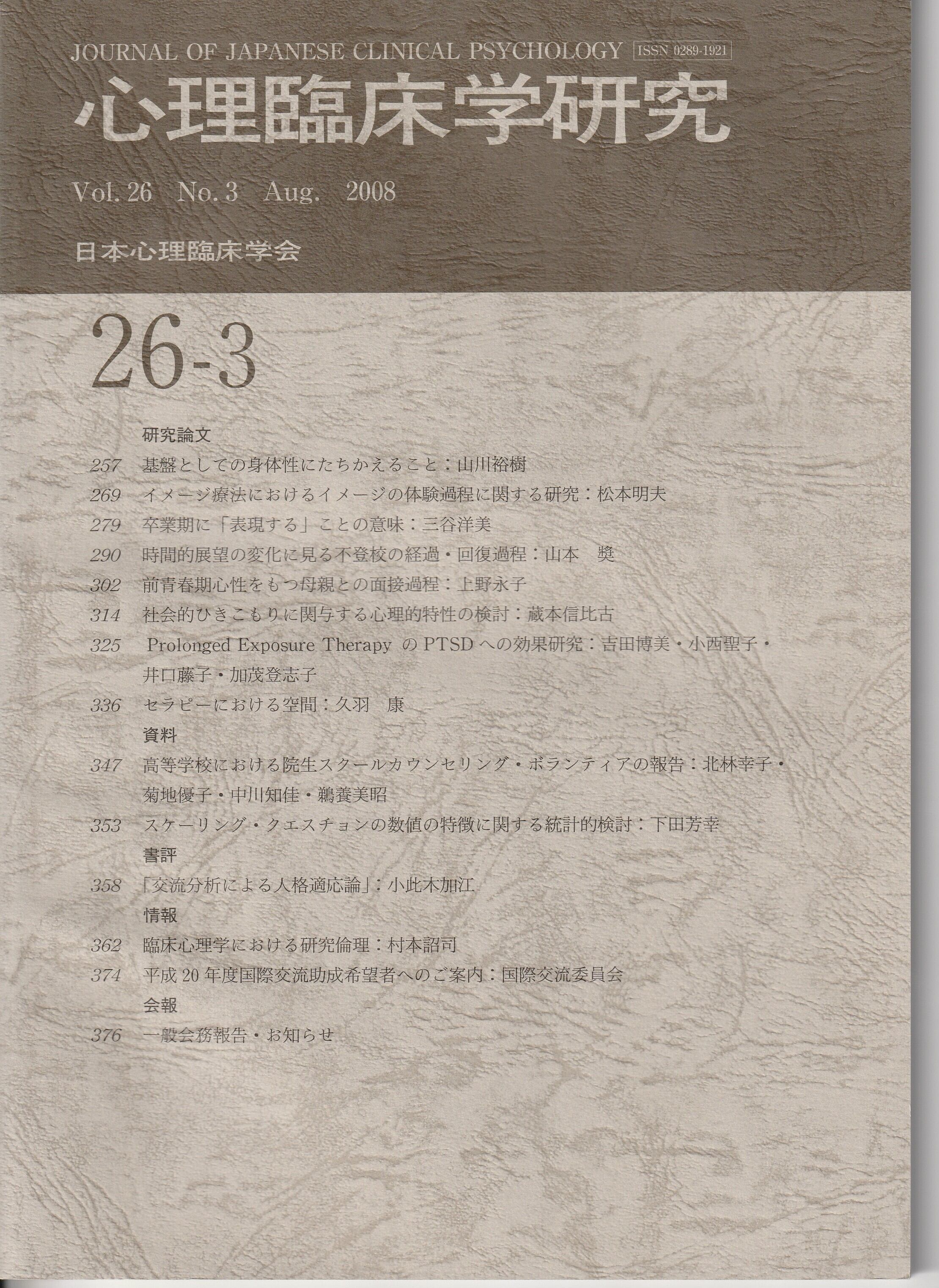 本の紹介:【研究論文】基盤としての身体性にたちかえること/ イメージ療法におけるイメージの体験過程に関する研究/卒業期に「表現する」ことの意味/時間的展望の変化に見る不登校の経過・回復過程/ 前青春期心性をもつ母親との面接過程/社会的ひきこもりに関与する心理的特性の検討/Prolonged Exposure TherapyのPTSDへの効果研究/セラピーにおける空間【資料】高等学校における院生スクールカウンセリング・ボランティアの報告/スケーリング・クエスチョンの数値の特徴に関する統計的検討【書評】 「交流分析による人格適応論」