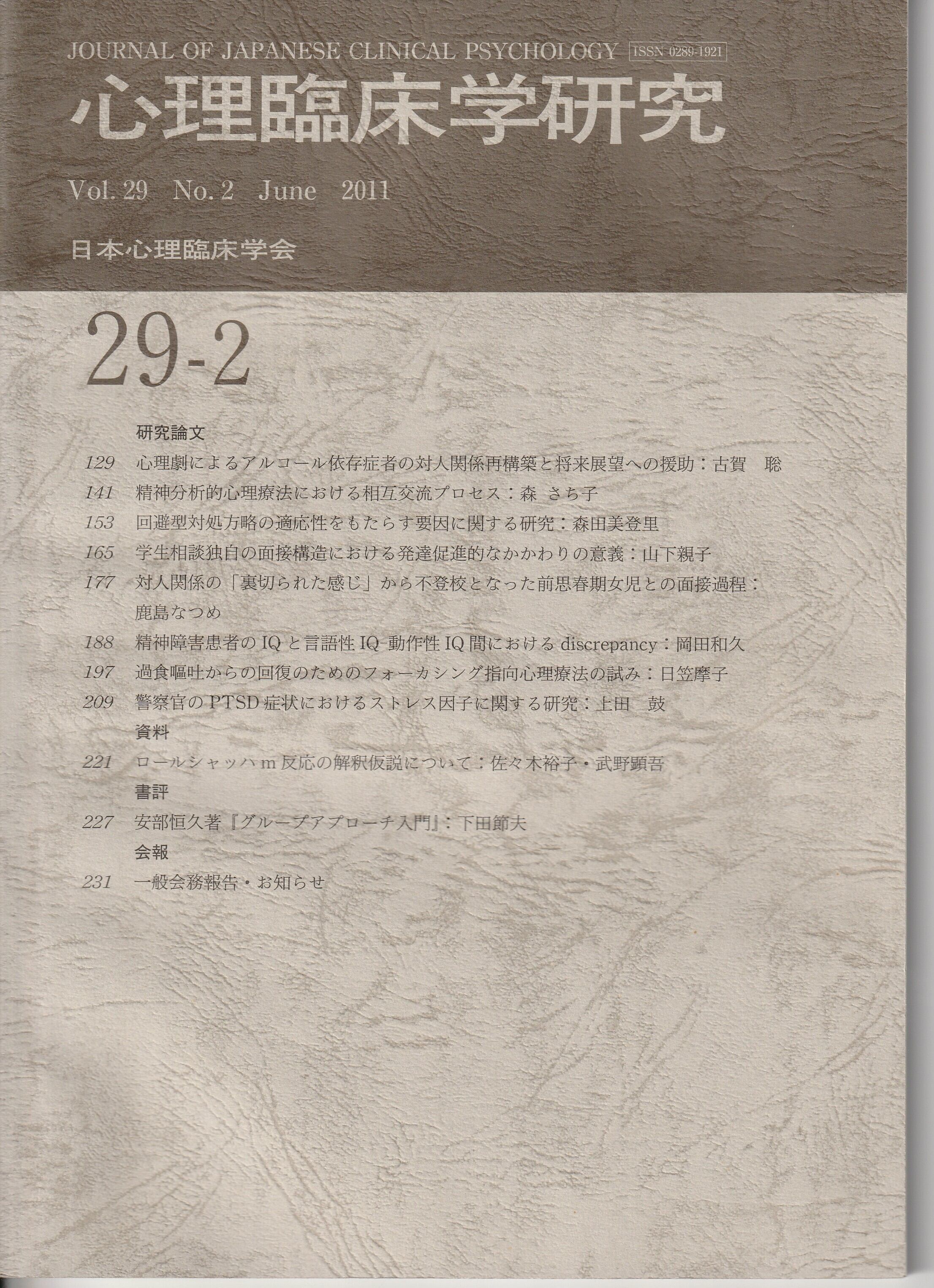 本の紹介:【研究論文】心理劇によるアルコール依存症者の対人関係再構築と将来展望への援助/精神分析的心理療法における相互交流プロセス/回避型対処方略の適応性をもたらす要因に関する研究/学生相談独自の面接構造における発達促進的なかかわりの意義/対人関係の「裏切られた感じ」から不登校となった前思春期女児との面接過程/精神障害患者のIQと言語性IQ—動作性IQ間におけるdiscrepancy /過食嘔吐からの回復のためのフォーカシング指向心理療法の試み/警察官のPTSD症状におけるストレス因子に関する研究【資料】ロールシャッハm反応の解釈仮説について【書評】安部恒久著『グループアプローチ入門』
