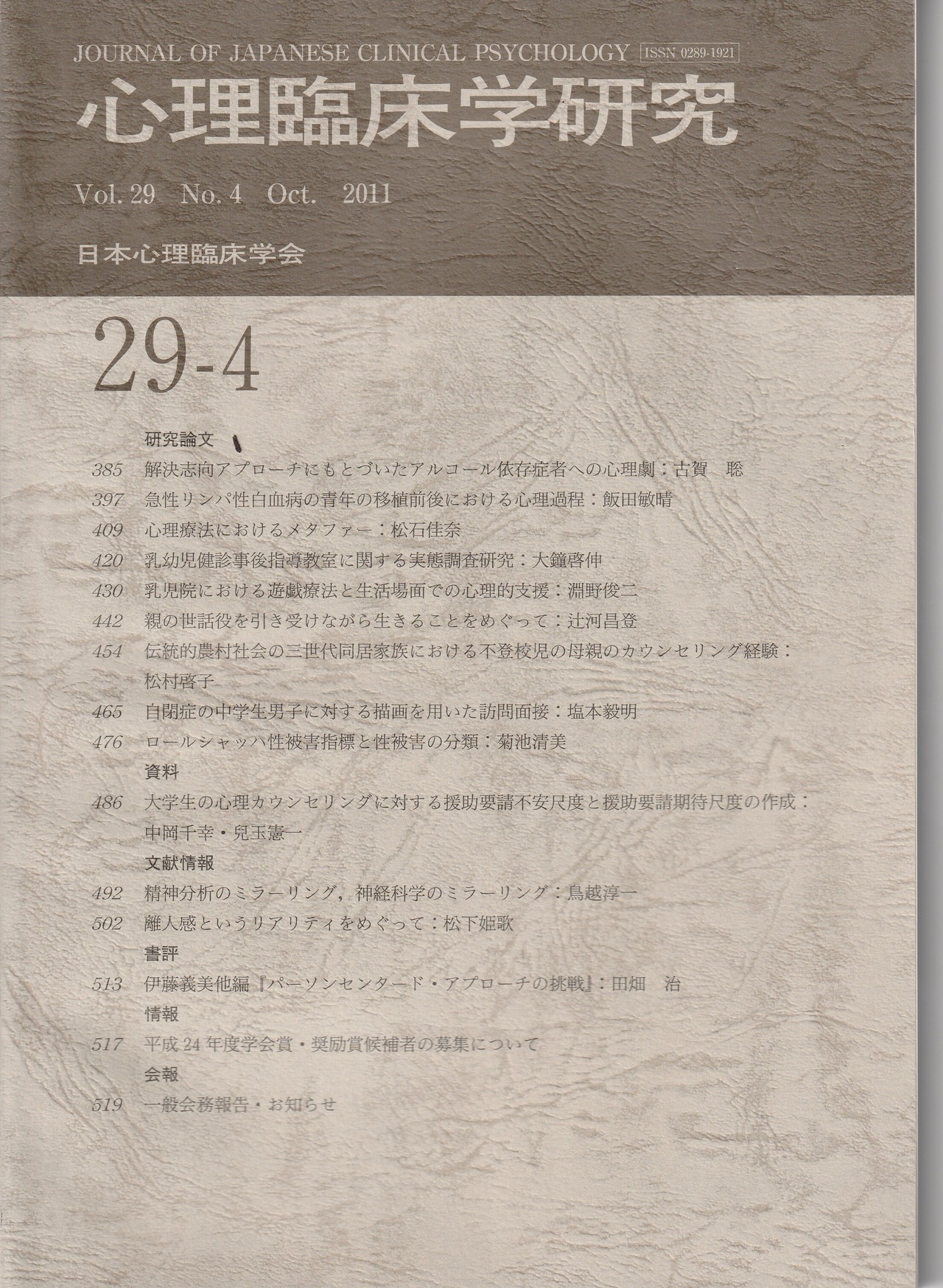 本の紹介:【研究論文】 解決志向アプローヂにもとづいたアルコール依存症者への心理劇/ 急性リンパ性白血病の青年の移植前後における心理過程/心理療法におけるメタファー/乳幼児健診事後指導教室に関する実態調査研究/乳児院における遊戯療法と生活場面での心理的支援/親の世話役を引き受けながら生きることをめぐって/伝統的農村社会の三世代同居家族における不登校児の母親のカウンセリング経験/自閉症の中学生男子に対する描画を用いた訪問面接/ロールシャッハ性被害指標と性被害の分類【資料】大学生の心理カウンセリングに対する援助要請不安尺度と援助要請期待尺度の作成【文献情報】精神分析のミラーリング,神経科学のミラーリング/離人感というリアリティをめぐって【書評】伊藤義美他編:『パーソンセンタード・アプローチの挑戦』