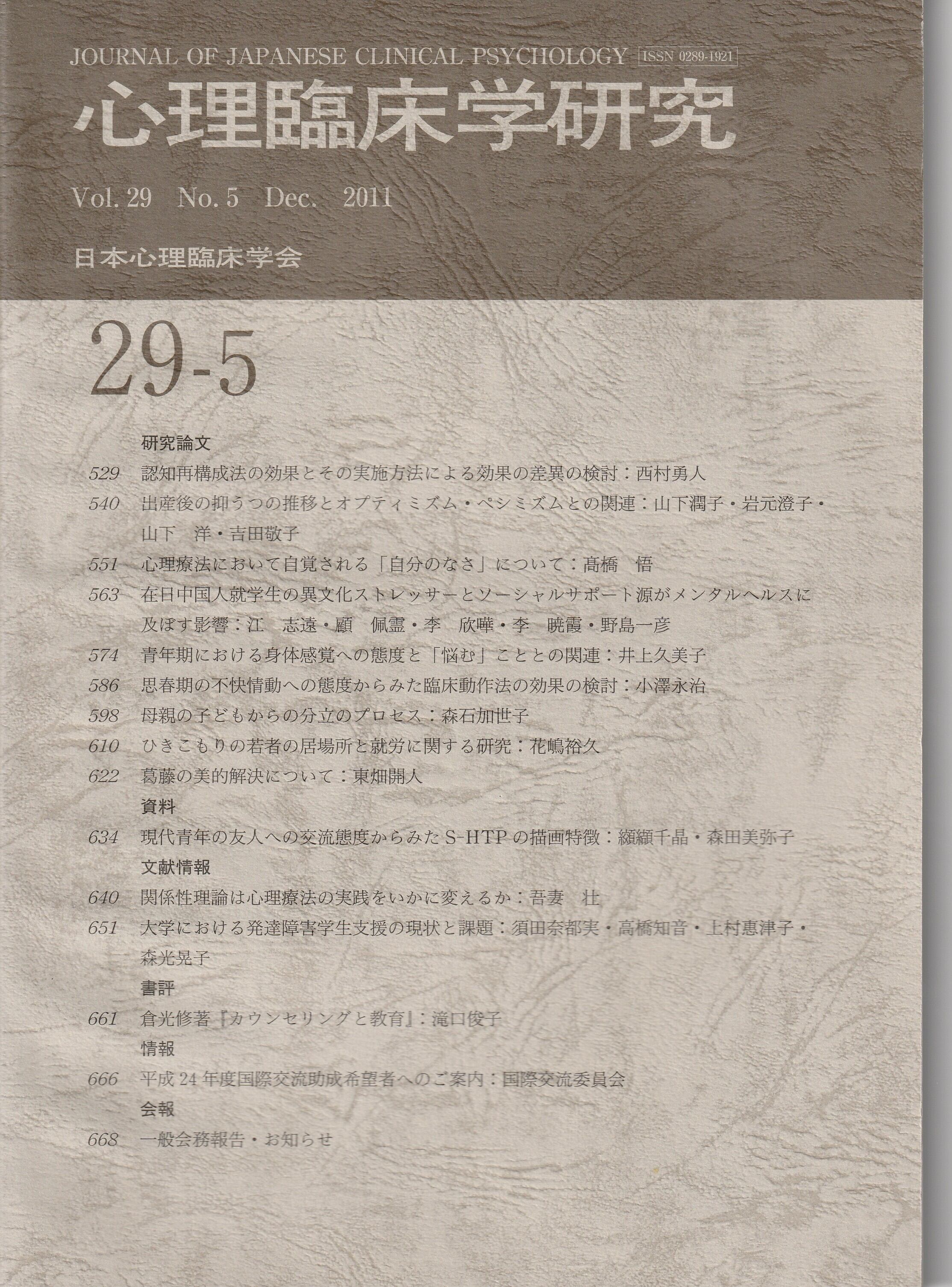 本の紹介:【研究論文】 認知再構成法の効果とその実施方法による効果の差異の検討/出産後の抑うつの推移とオプティミズム・ペシミズムとの関連/心理療法において自覚される「自分のなさ」について/在日中国人就学生の異文化ストレッサーとソーシャルサポート源がメンタルヘルスに及ぼす影響/青年期における身体感覚への態度と「悩む」こととの関連/思春期の不快情動への態度からみた臨床動作法の効果の検討/母親の子どもからの分立のプロセス/ ひきこもりの若者の居場所と就労に関する研究/葛藤の美的解決について【資料】現代青年の友人への交流態度からみたS-HTPの描画特徴【文献情報】関係性理論は心理療法の実践をいかに変えるか:吾妻壮/大学における発達障害学生支援の現状と課題【書評】倉光修著『カウンセリングと教育』
