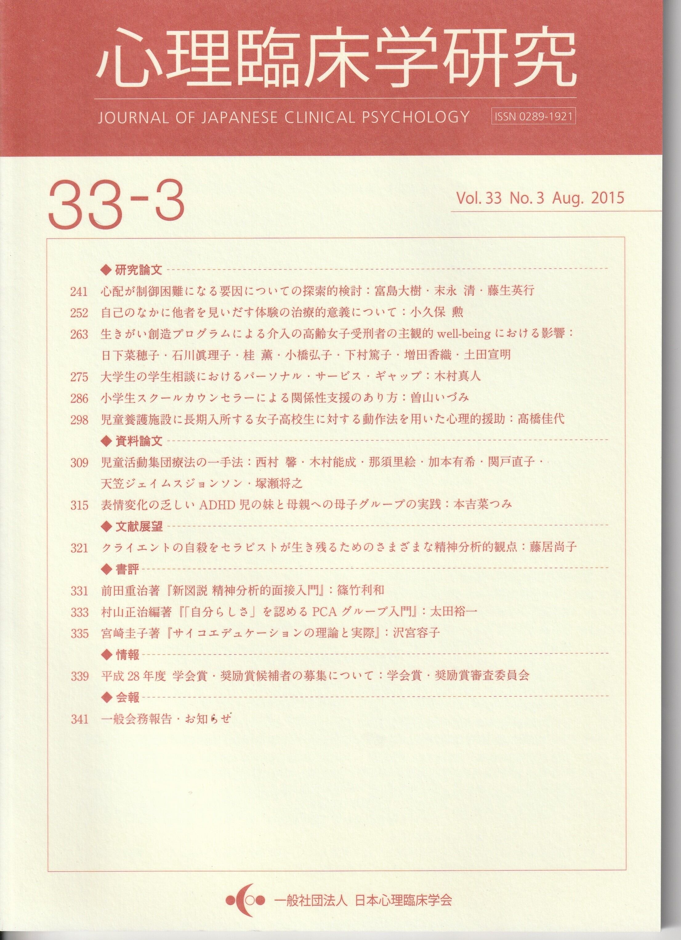 本の紹介:【研究論文】心配が制御困難になる要因についての探索的検討/自己のなかに他者を見いだす体験の治療的意義について/生きがい創造プログラムによる介入の高齢女子受刑者の主観的well-beingにおける影響/大学生の学生相談におけるバーソナル・サービス・ギャップ/小学生スクールカウンセラーによる関係性支援のあり方/児童養護施設に長期入所する女子高校生に対する動作法を用いた心理的援助【資料論文】児童活動集団療法の一手法/表情変化の乏しいADHD児の妹と母親への母子グループの実践【文献展望】クライエントの自殺を七ラピストが生き残るためのさまざまな精神分析的観点【書評】前田重治著『新図説精神分析的面接入門』/ 村山正治編著『「自分らしさ」を認めるPCAグループ入門』/宮崎圭子著『サイコエデュケーションの理論と実際』