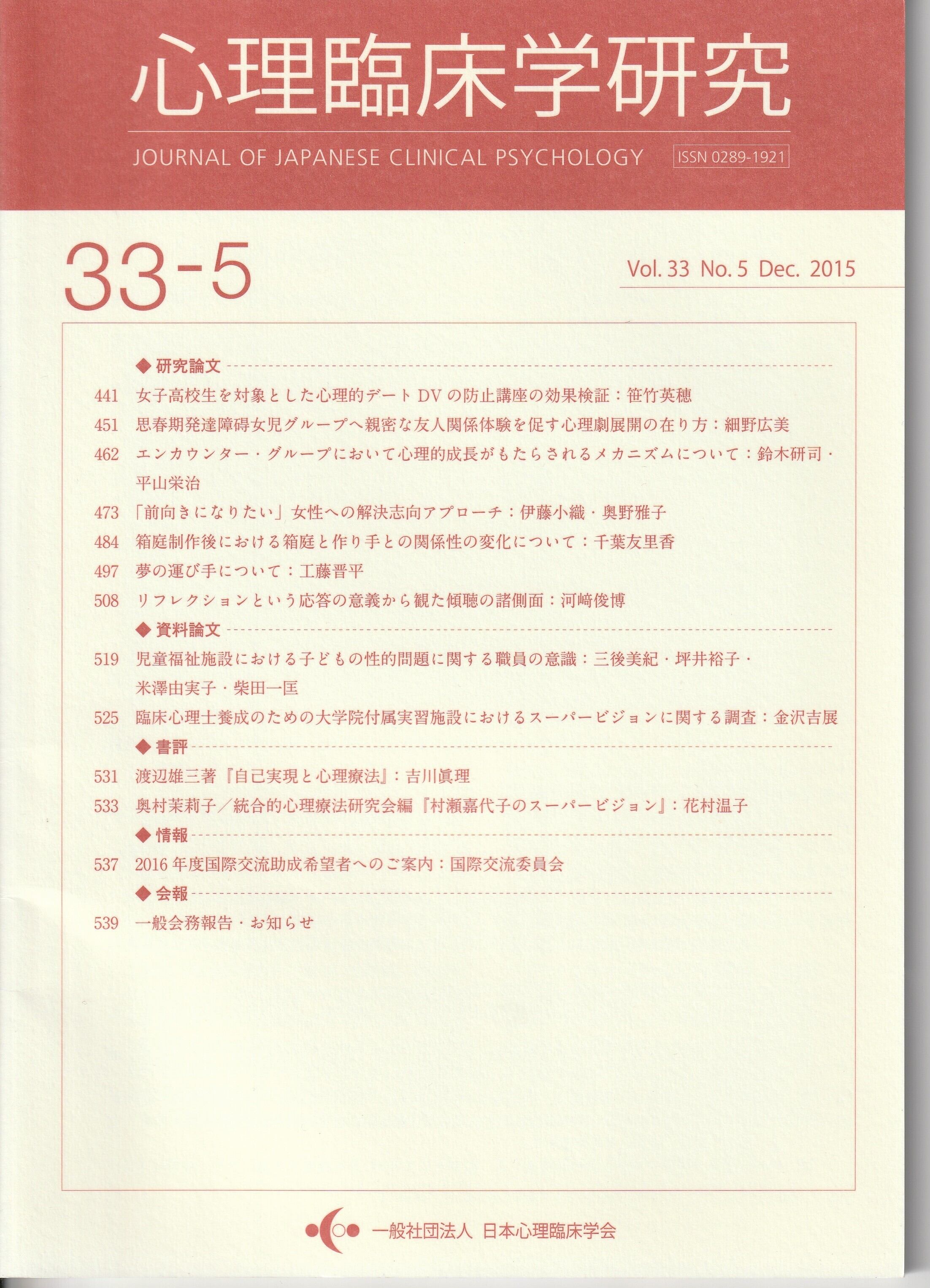 本の紹介:【研究論文】女子高校生を対象とした心理的デートDVの防止講座の効果検証/思春期発達障碍女児グループヘ親密な友人関係体験を促す心理劇展開の在り方/エンカウンター・グループにおいて心理的成長がもたらされるメカニズムについて/「前向きになりたい」女性への解決志向アプローチ/箱庭制作後における箱庭と作り手との関係性の変化について 夢の運び手について/リフレクションという応答の意義から観た傾聴の諸側面【資料論文】児童福祉施設における子どもの性的問題に関する職員の意識/臨床心理士養成のための大学院付属実習施設におけるスーパービジョンに関する調査【書評】渡辺雄三著『自己実現と心理療法』/奥村茉莉子/統合的心理療法研究会編「村瀬嘉代子のスーパービジョン」