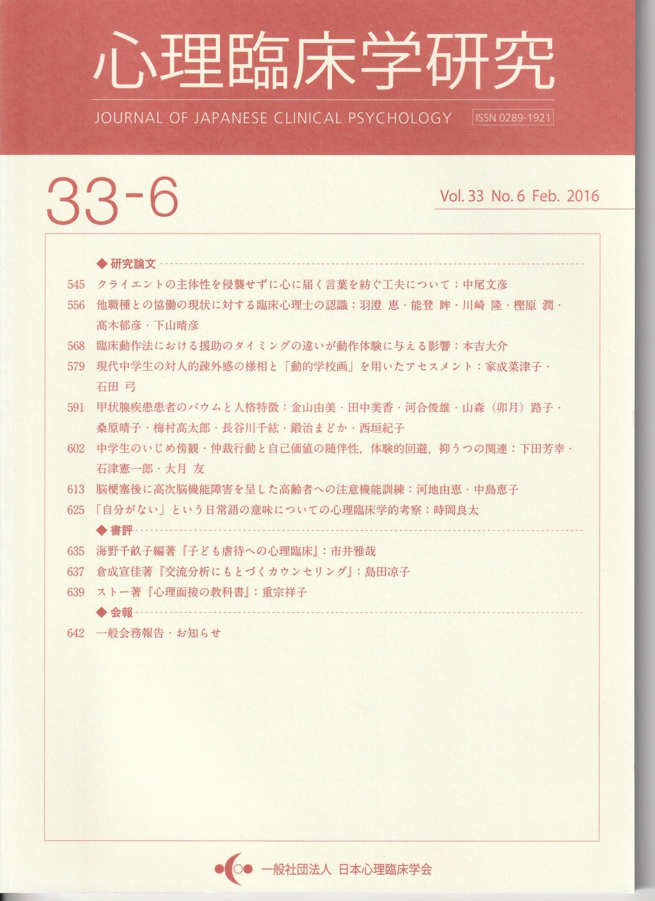 本の紹介:【研究論文】クライエントの主体性を侵襲せずに心に届く言葉を紡ぐ工夫について/他職種との協働の現状に対する臨床心理士の認識/臨床動作法における援助のタイミングの違いが動作体験に与える影響/現代中学生の対人的疎外感の様相と「動的学校画」を用いたアセスメント/甲状腺疾患患者のバウムと人格特徴/中学生のいじめ傍観・仲裁行動と自己価値の随伴性.体験的回避,抑うつの関連/脳梗塞後に庫次脳機能障害を呈した高齢者への注意機能訓練/「自分がない」という日常語の意味についての心理臨床学的考察【書評】海野千畝子編著『子ども虐待への心理臨床』/倉成宣佳著『交流分析にもとづくカウンセリング』/