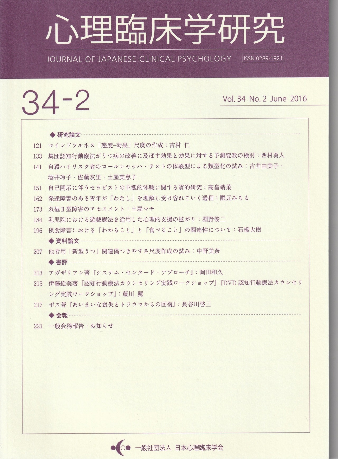 本の紹介:【研究論文】マインドフルネス「態度—効果」尺度の作成/集団認知行動療法がうつ病の改善に及ばす効果と効果に対する予測変数の検討/自殺ハイリスク者のロールシャッハ・テストの体験型による類型化の試み/自己開示に伴うセラビストの主観的体験に関する質的研究/発達障害のある青年が「わたし」を理解し受け容れていく過程/双極Ⅱ型障害のアセスメント/乳児院における遊戯療法を活用した心理的支援の拡がり/摂食障害における「わかること」と「食べること」の関連性について【資料論文】他者用「新型うつ」関連傷つきやすさ尺度作成の試み【書評】アガザリアン著『システム・センタード・アプローチ』/伊藤絵美著『認知行動療法カウンセリング実践ワークショップ』『DVD認知行動療法カウン七リング実践ヮークショップ』/ボス著『あいまいな喪失とトラウマからの回復』