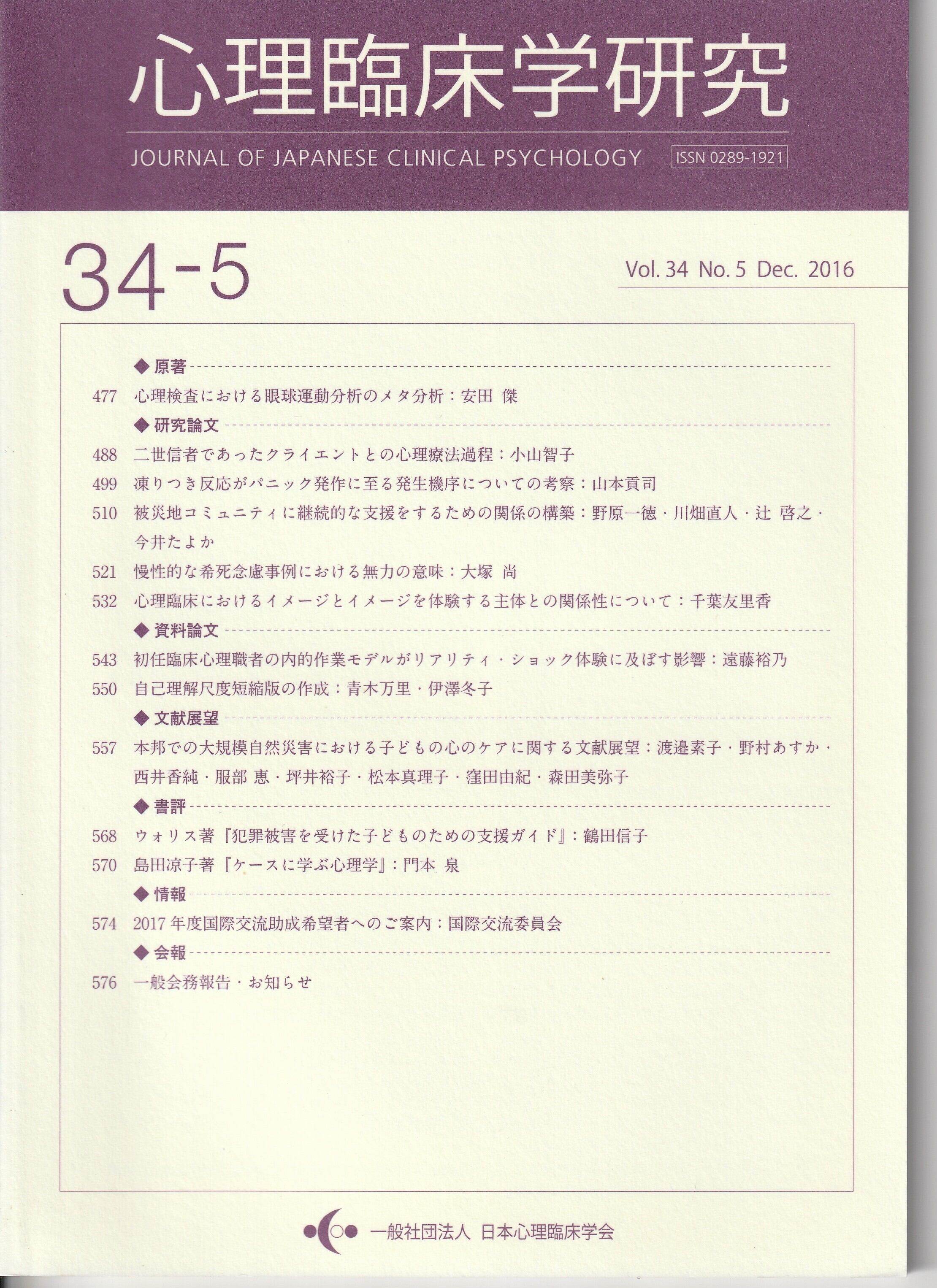 本の紹介:【原著】心理検査における眼球運動分析のメタ分析【研究論文】二世信者であったクライエントとの心理療法過程/凍りつき反応がパニック発作に至る発生機序についての考察/被災地コミュニティに継続的な支援をするための関係の構築/慢性的な希死念慮事例における無力の意味/心理臨床におけるイメージとイメージを体験する主体との関係性について