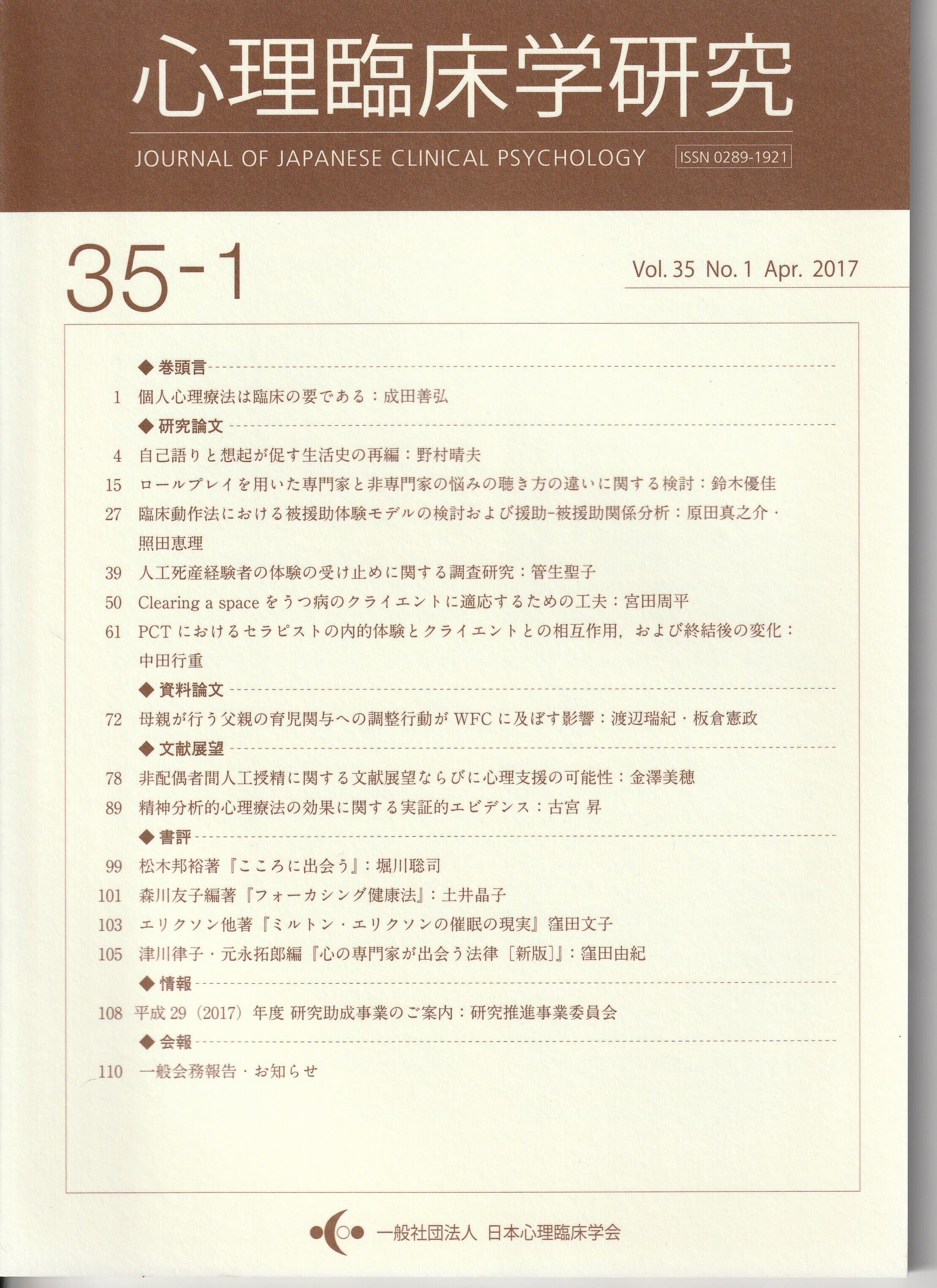 【資料論文】母親が行う父親の育児関与への調整行動がWFCに及ばす影響【文献展望】非配偶者間人工授精に関する文献展望ならびに心理支援の可能性/精神分析的心理療法の効果に関する実証的エビデンス【書評】 松木邦裕著『こころに出会う』/森川友子編著『フォーカシング健康法』/エリクソン他著『ミルトン・エリクソンの催眠の現実』/津川律子・元永拓郎編『心の専門家が出会う法律[新版]』