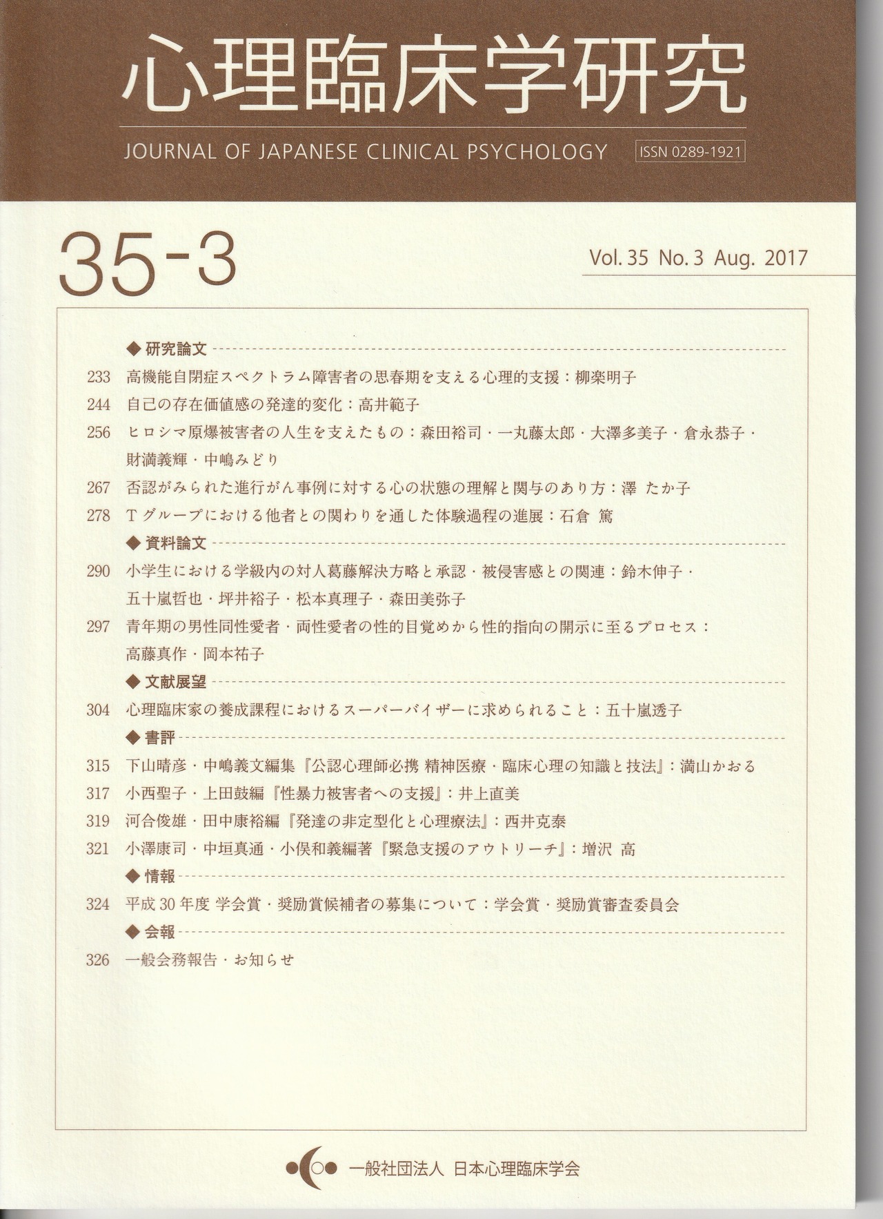 本の紹介:【研究論文】 高機能自閉症スペクトラム障害者の思春期を支える心理的支援/自己の存在価値感の発達的変化/ヒロシマ原爆被害者の人生を支えたもの/否認がみられた進行がん事例に対する心の状態の理解と関与のあり方/Tグループにおける他者との関わりを通した体験過程の進展【資料論文】小学生における学級内の対人葛藤解決方略と承認・被侵害感との関連/青年期の男性同性愛者・両性愛者の性的目覚めから性的指向の開示に至るプロセス