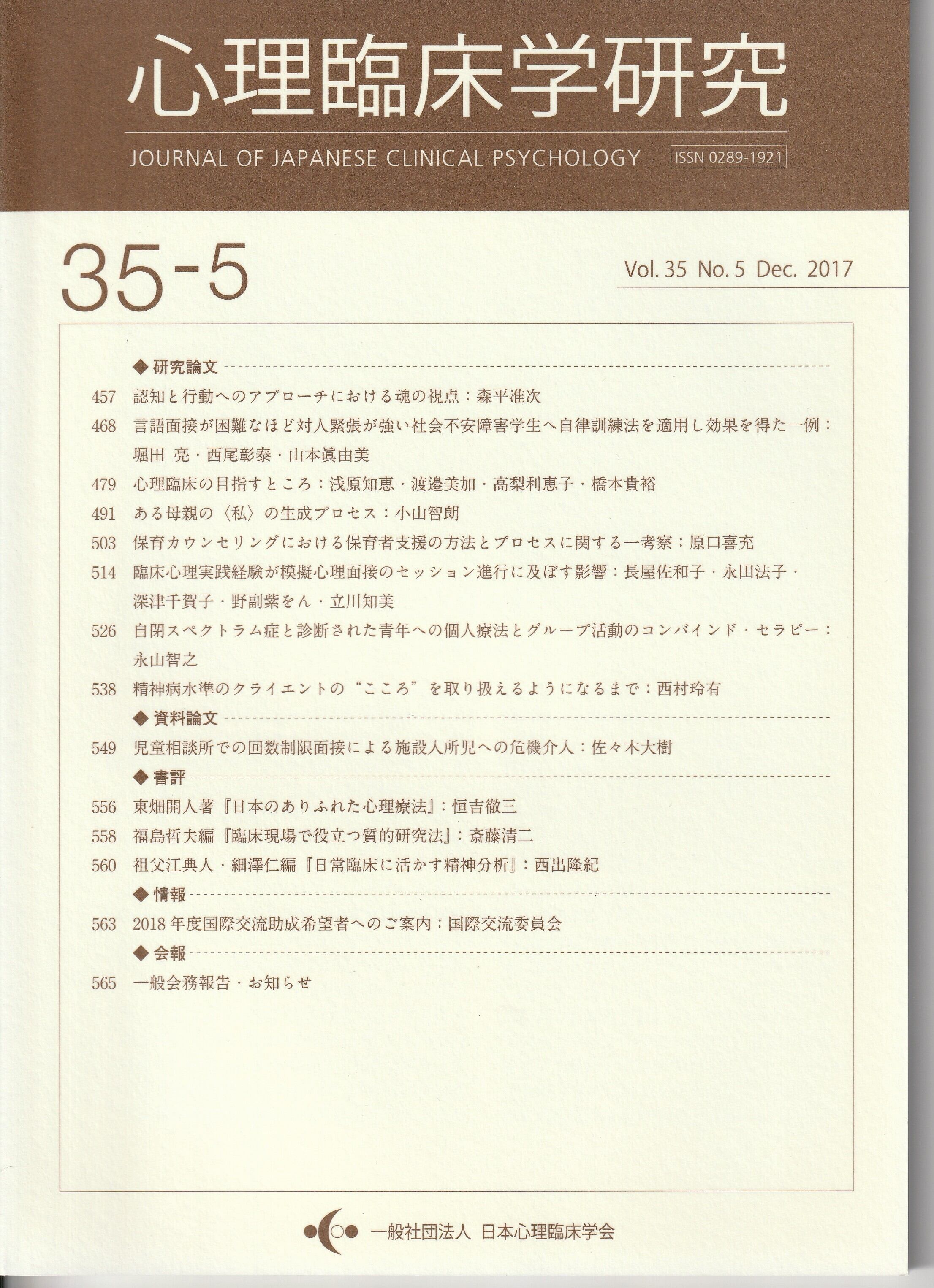 本の紹介:【研究論文】認知と行動へのアプローチにおける魂の視点/言語面接が困難なほど対人緊張が強い社会不安障害学生へ自律訓練法を適用し効果を得た一例/心理臨床の目指すところ/ある母親の〈私〉の生成プロセス/保育カウンセリングにおける保育者支援の方法とプロセスに関する一考察/臨床心理実践経験が模擬心理面接のセッション進行に及ぼす影響/自閉スペクトラム症と診断された青年への個人療法とグループ活動のコンバインド・セラビー/ 精神病水準のクライエントの“こころ”を取り扱えるようになるまで【資料論文】児童相談所での回数制限面接による施設入所児への危機介入【書評】東畑開人著『日本のありふれた心理療法』/福島哲夫編『臨床現場で役立つ質的研究法』/祖父江典人・細澤仁編『日常臨床に活かす精神分析』