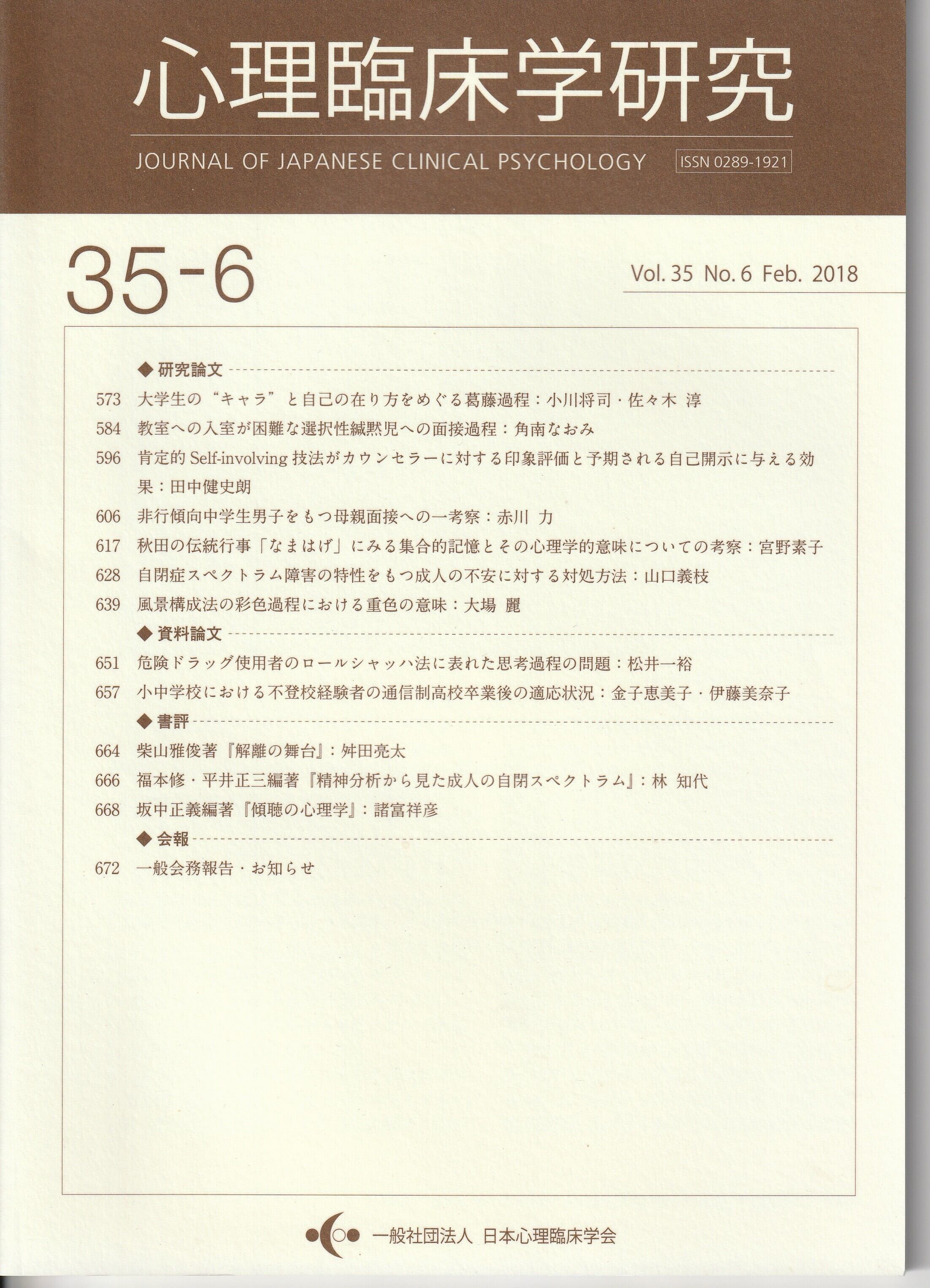 本の紹介:【研究論文】大学生の"キャラ”と自己の在り方をめぐる葛藤過程/教室への入室が困難な選択性絨黙児への面接過程/肯定的Self-involving技法がカウンセラーに対する印象評価と予期される自己開示に与える効果/非行傾向中学生男子をもつ母親面接への一考察/ 秋田の伝統行事「なまはげ」にみる集合的記憶とその心理学的意味についての考察/自閉症スペクトラム障害の特性をもつ成人の不安に対する対処方法/風景構成法の彩色過程における重色の意味【資料論文】危険ドラッグ使用者のロールシャッハ法に表れた思考過程の問題/小中学校における不登校経験者の通信制高校卒業後の適応状況【書評】柴山雅俊著『解離の舞台』/福本修・平井正三編著『精神分析から見た成人の自閉スペクトラム』/坂中正義編著『傾聴の心理学』