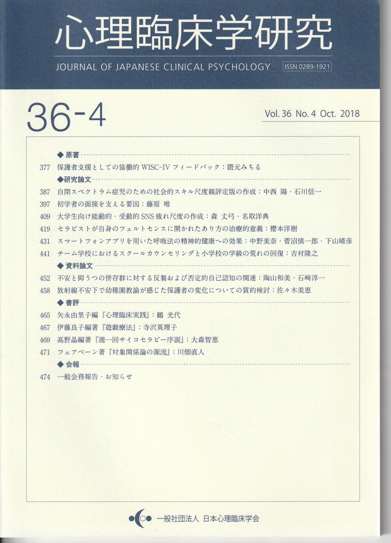 本の紹介:【原著】保護者支援としての協働的WISC-IVフィードバック【研究論文】 自閉スペクトラム症児のための社会的スキル尺度親評定版の作成/初学者の面接を支える要因/大学生向け能動的・受動的SNS疲れ尺度の作成/セラピストが自身のフェルトセンスに開かれたあり方の治療的意義/スマートフォンアプリを用いた呼吸法の精神的健康への効果/チーム学校におけるスクールカウンセリングと小学校の学級の荒れの回復【資料論文】不安と抑うつの併存群に対する反協および否定的自己認知の関連/放射線不安下で幼稚園教諭が感じた保護者の変化についての質的検討【書評】矢永由里子編『心理臨床実践』/伊藤良子編著『遊戯療法』/高野晶編著『週一回サイコセラヒ°ー序説』/フェアベーン著『対象関係論の源流』