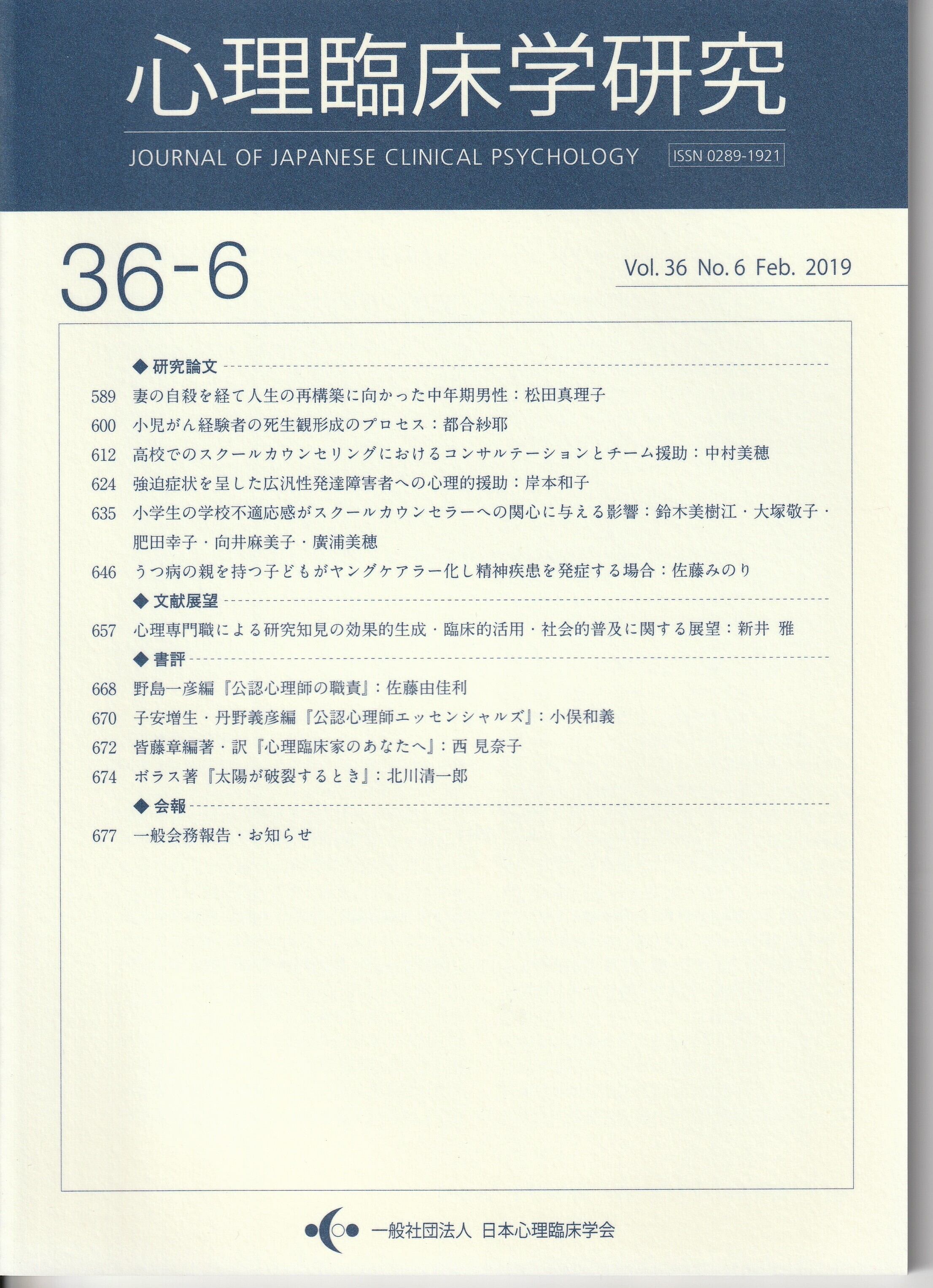 本の紹介:【研究論文】妻の自殺を経て人生の再構築に向かった中年期男性/小児がん経験者の死生観形成のプロセス/ 高校でのスクールカウンセリングにおけるコンサルテーションとチーム援助/強迫症状を呈した広汎性発達節害者への心理的援助/小学生の学校不適応感がスクールカウンセラーヘの関心に与える影響/うつ病の親を持つ子どもがヤングケアラー化し精神疾患を発症する場合【文献展望】心理専門職による研究知見の効果的生成・臨床的活用・社会的普及に関する展望【書評】野島一彦編『公認心理師の職責』/子安増生・丹野義彦編『公認心理師エッセンシャルズ』/皆藤章編著・訳『心理臨床家のあなたへ』/ボラス著『太陽が破裂するとき』