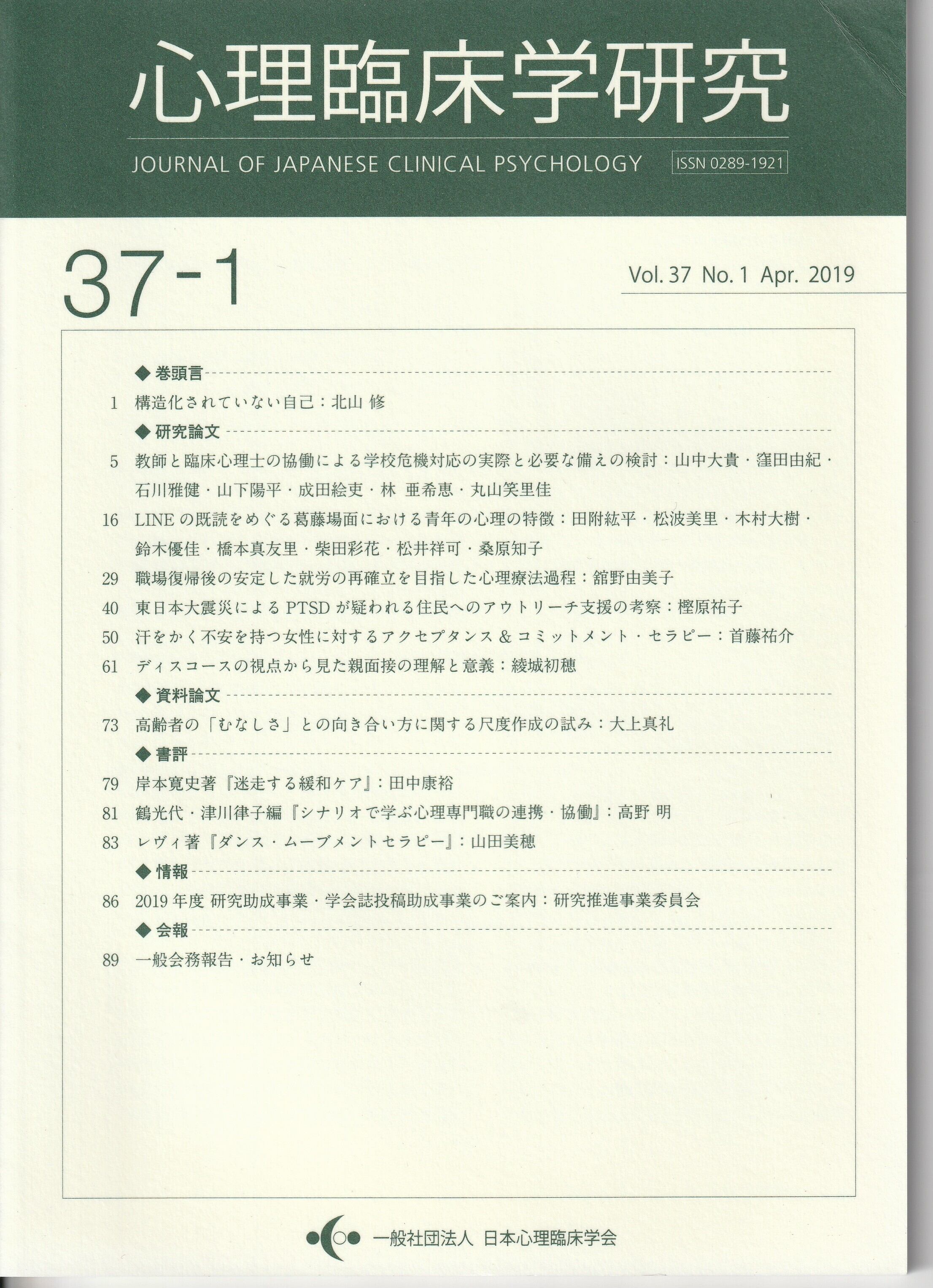 本の紹介:【巻頭言】構造化されていない自己【研究論文】教師と臨床心理—上の協働による学校危機対応の実際と必要な備えの検討/ LINEの既読をめぐる葛藤場面における青年の心理の特徴/職場復帰後の安定した就労の再確立を目指した心理療法過程/東日本大震災によるPTSDが疑われる住民へのアウトリーチ支援の考察/汗をかく不安を持つ女性に対するアクセプタンス&コミットメント・セラピー/ディスコースの視点から見た親面接の理解と意義【資料論文】高齢者の「むなしさ」との向き合い方に関する尺度作成の試み【書評】岸本寛史著『迷走する緩和ケア』/鶴光代・津川律子編『シナリオで学ぶ心理専門職の連携・協働』/ レヴィ著『ダンス・ムープメントセラビー』