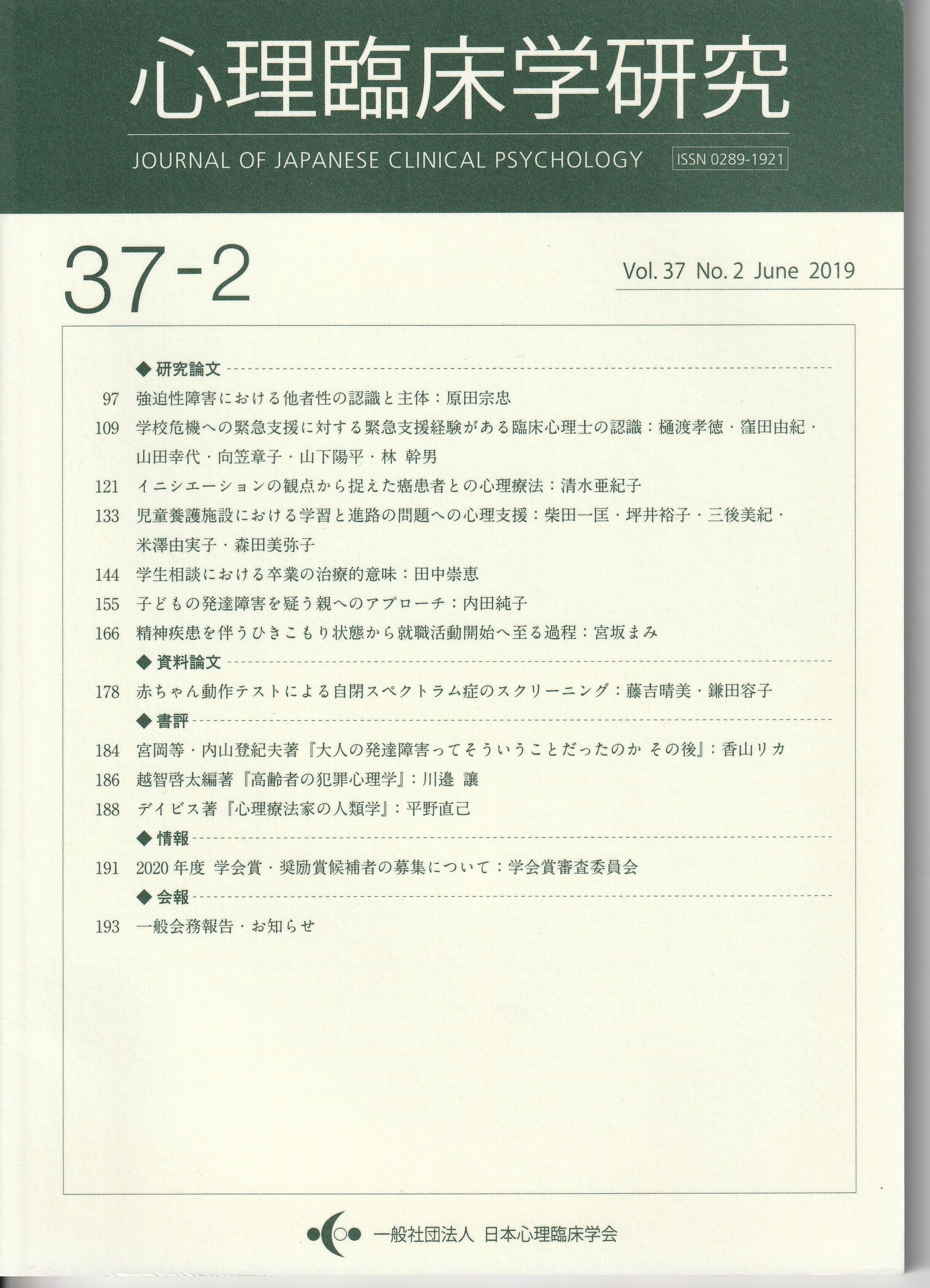 本の紹介:【研究論文】強追性障害における他者性の認識と主体/学校危機への緊急支援に対する緊急支援経験がある臨床心理士の認識/イニシエーションの観点から捉えた癌患者との心理療法/児童養護施設における学習と進路の問題への心理支援/学生相談における卒業の治療的意味/子どもの発達障害を疑う親へのアプローチ/精神疾患を伴うひきこもり状態から就職活動開始へ至る過程【資料論文】赤ちゃん動作テストによる自閉スペクトラム症のスクリーニング【書評】宮岡等・内山登紀夫著『大人の発達障害ってそういうことだったの力、その後』/越智啓太編著『高齢者の犯罪心理学』/デイビス著『心理療法家の人類学』
