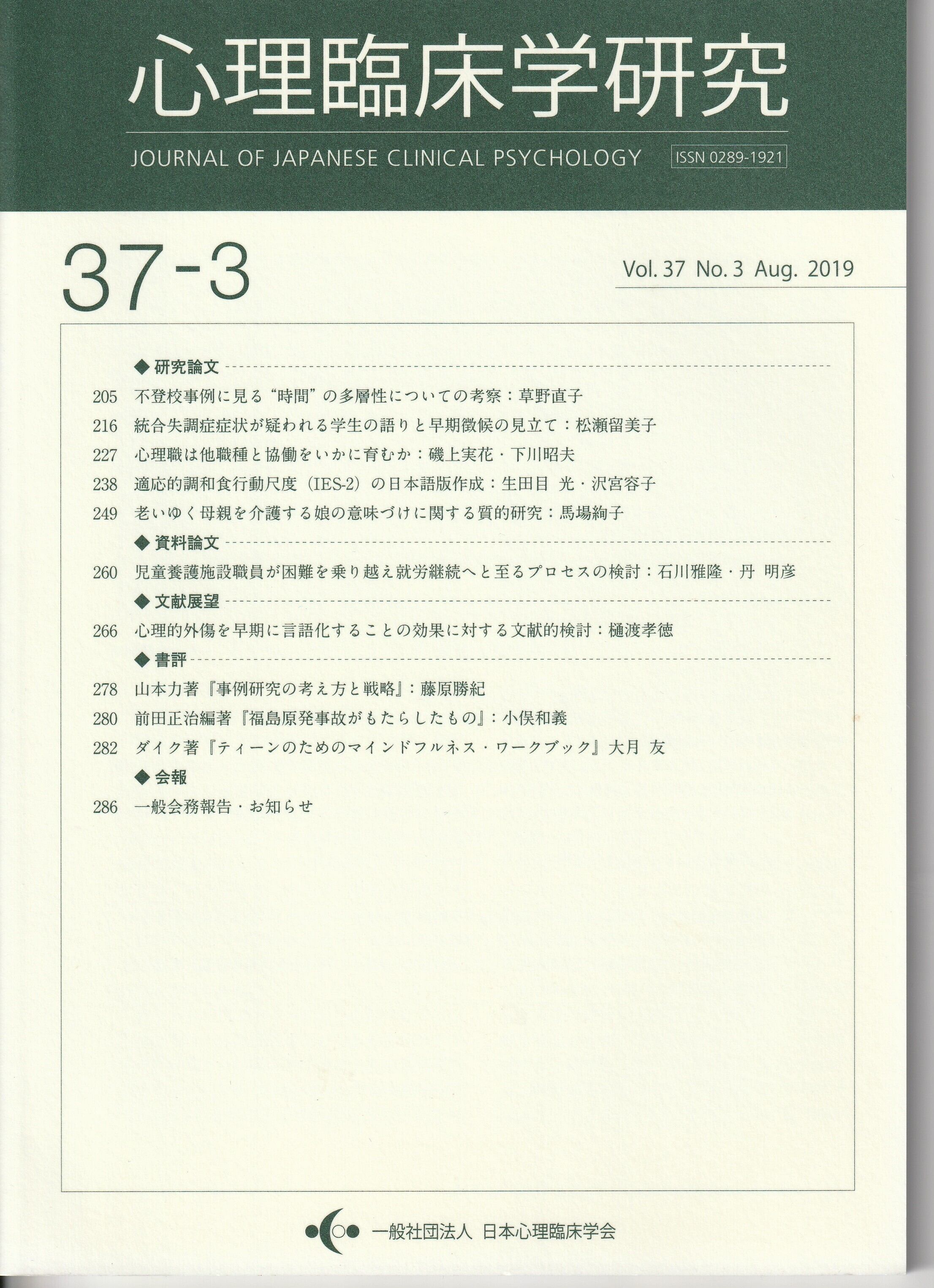 本の紹介:【研究論文】不登校事例に見る'‘時間’'の多層性についての考察/統合失調症症状が疑われる学生の語りと早期徴候の見立て/心理職は他職種と協働をいかに育むか/適応的調和食行動尺度(IES-2)の日本語版作成/老いゆく母親を介護する娘の意味づけに関する質的研究【資料論文】児童養護施設職員が困難を乗り越え就労継続へと至るプロセスの検討【文献展望】心理的外傷を早期に言語化することの効果に対する文献的検討【書評】山本力著『事例研究の考え方と戦略』/前田正治編著『福島原発事故がもたらしたもの』/ダイク著『ティーンのためのマインドフルネス・ワークブック』