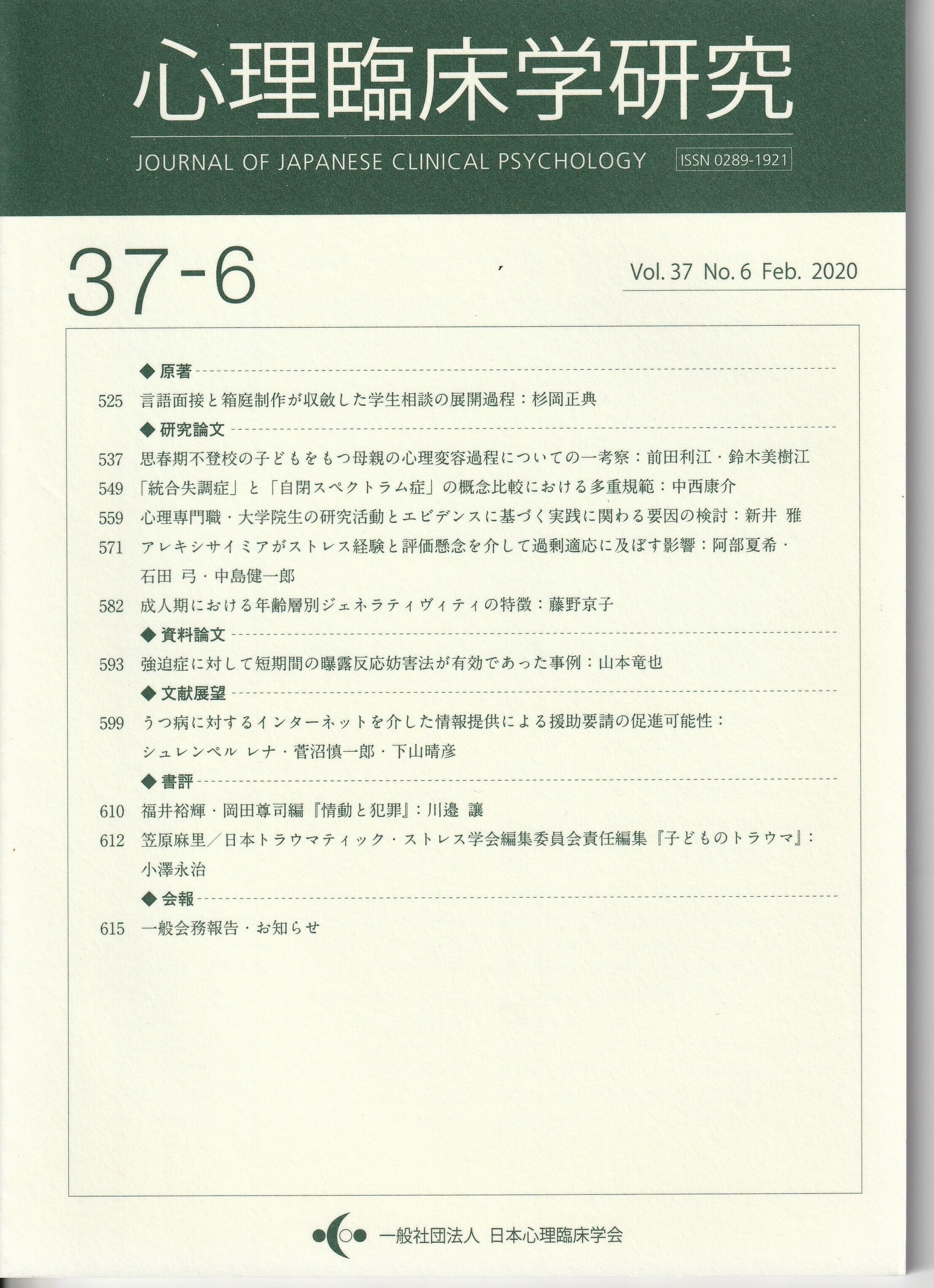本の紹介:【原著】言語面接と箱庭制作が収敏した学生相談の展開過程【研究論文】思春期不登校の子どもをもつ母親の心理変容過程についての一考察/「統合失調症」と「自閉スペクトラム症」の概念比較における多重規範/心理専門職・大学院生の研究活動とエビデンスに基づく実践に関わる要因の検討/アレキシサイミアがストレス経験と評価懸念を介して過剰適応に及ばす影響/成人期における年齢庖別ジェネラティヴィティの特徴【資料論文】強迫症に対して短期間の曝露反応妨害法が有効であった事例【文献展望】うつ病に対するインターネットを介した情報提供による援助要請の促進可能性【書評】福井裕輝・岡田尊司編『情動と犯罪』/ 笠原麻里/日本トラウマティック・ストレス学会編集委員会責任編集『子どものトラウマ』