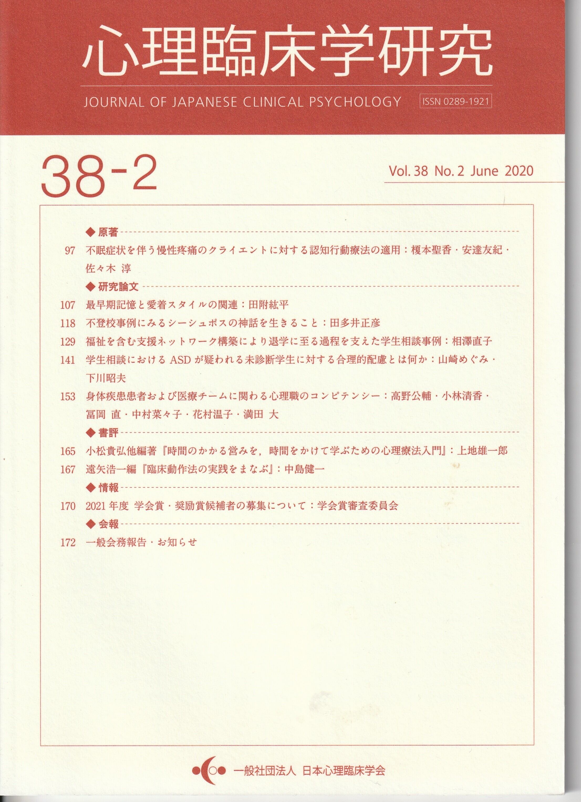本の紹介:【原著】不眠症状を伴う慢性疼痛のクライエントに対する認知行動療法の適用【研究論文】最早期記憶と愛着スタイルの関連/不登校事例にみるシーシュポスの神話を生きること/福祉を含む支援ネットワーク構築により退学に至る過程を支えた学生相談事例/学生相談におけるASDが疑われる未診断学生に対する合理的配慮とは何か/身体疾患患者および医療チームに関わる心理職のコンピテンシー【書評】小松貴弘他編著『時間のかかる営みを,時間をかけて学ぶための心理療法入門』/遠矢浩一編『臨床動作法の実践をまなぶ』