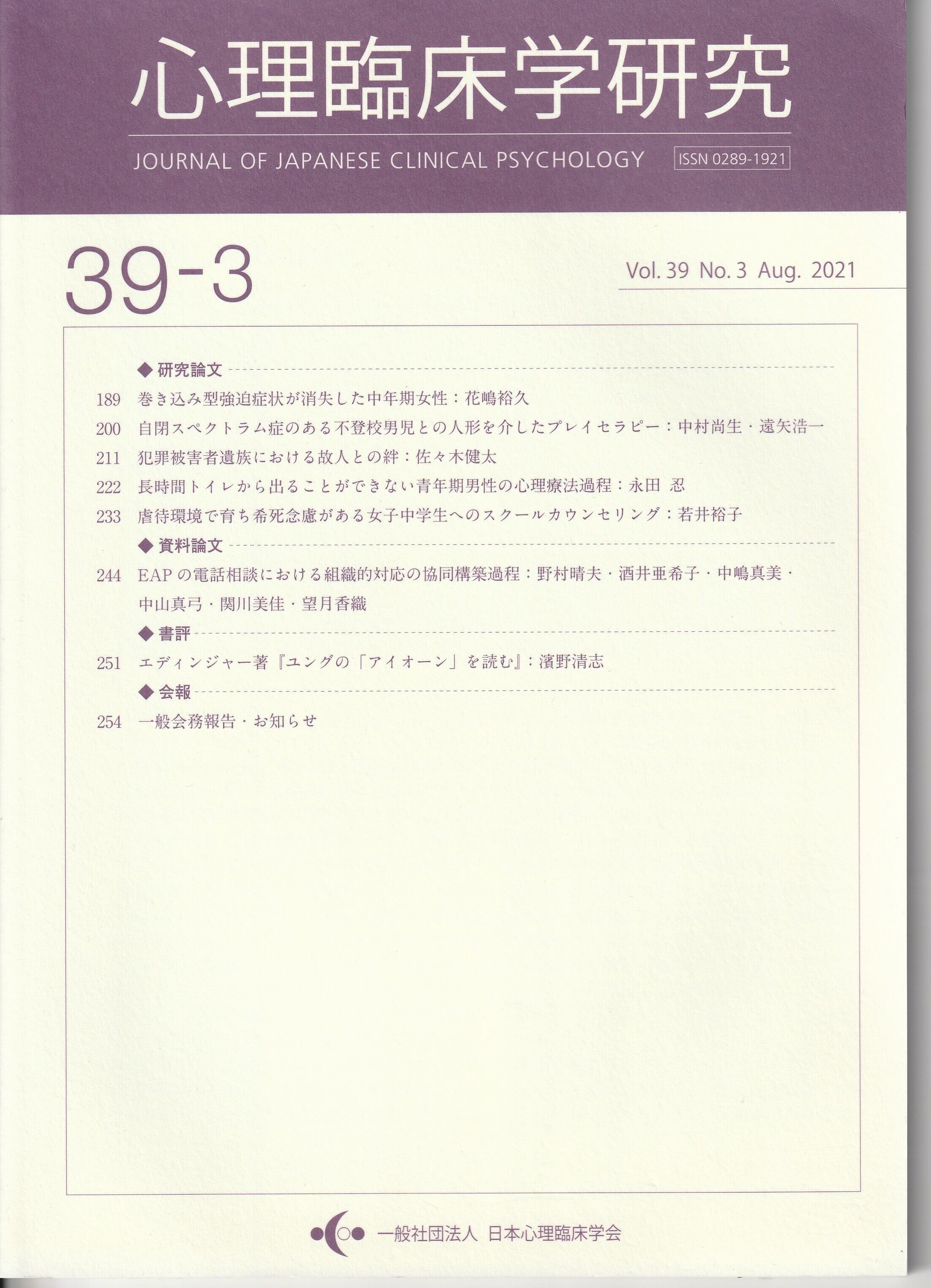 本の紹介:【研究論文】巻き込み型強迫症状が消失した中年期女性/自閉スペクトラム症のある不登校男児との人形を介したプレイセラヒ°ー/犯罪被害者遺族における故人との絆/長時間トイレから出ることができない青年期男性の心理療法過程/虐待環境で育ち希死念虚がある女子中学生へのスクールカウンセリング【資料論文】EAPの電話相談における組織的対応の協同構築過程【書評】エディンジャー著『ユングの「アイオーン」を読む』