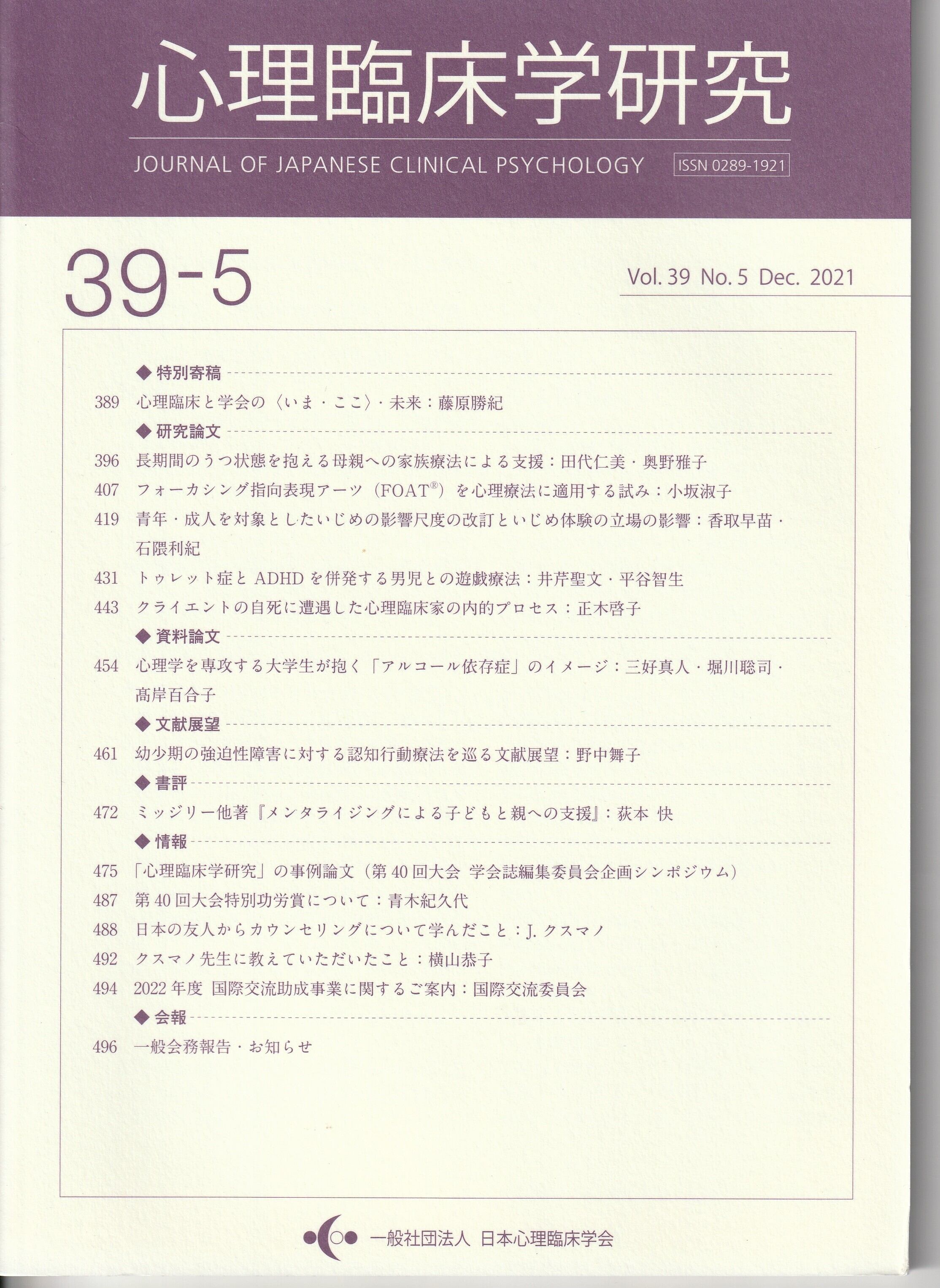 本の紹介:【特別寄稿】心理臨床と学会の〈いま・ここ〉・未来【研究論文】長期間のうつ状態を抱える母親への家族療法による支援/フォーカシング指向表現アーツ(FOAT®)を心理療法に適用する試み/青年・成人を対象としたいじめの影響尺度の改訂といじめ体験の立場の影磐/トゥレット症とADHDを併発する男児との遊戯療法/クライエントの自死に遭遇した心理臨床家の内的プロセス【資料論文】心理学を専攻する大学生が抱く「アルコール依存症」のイメージ【文献展望】幼少期の強追性障害に対する認知行動療法を巡る文献展望【書評】ミッジリー他著『メンタライジングによる子どもと親への支援』