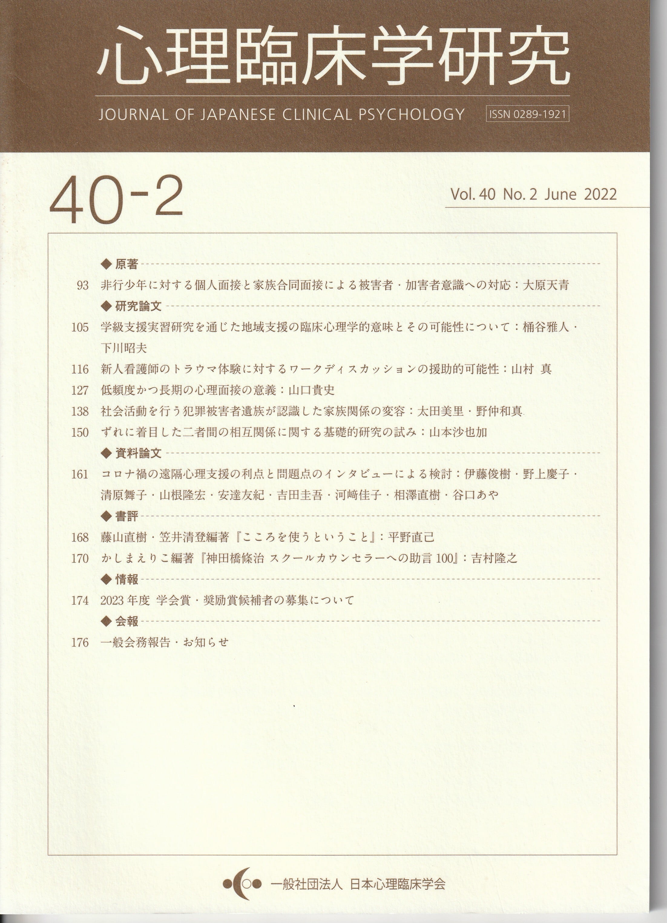 本の紹介:【原著】非行少年に対する個人面接と家族合同面接による被害者・加害者意識への対応【研究論文】学級支援実習研究を通じた地域支援の臨床心理学的意味とその可能性について/新人看護師のトラウマ体験に対するワークディスカッションの援助的可能性/低頻度かつ長期の心理面接の意義/社会活動を行う犯罪被害者遺族が認識した家族関係の変容/ずれに着目した二者間の相互関係に関する基礎的研究の試み【資料論文】コロナ禍の遠隔心理支援の利点と問題点のインタビューによる検討【書評】藤山直樹・笠井清登編著『こころを使うということ』/かしまえりこ編著『神田橋條治スクールカウンセラーヘの助言100』