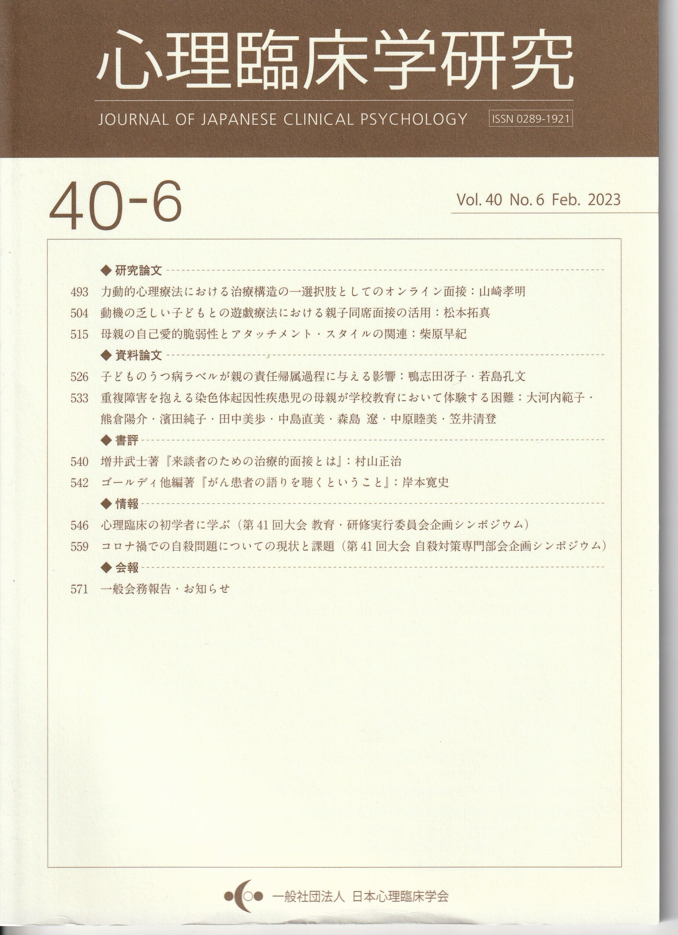 本の紹介:【研究論文】カ動的心理療法における治療構造のー選択肢としてのオンライン面接/動機の乏しい子どもとの遊戯療法における親子同席面接の活用/母親の自己愛的脆弱性とアタッチメント・スタイルの関連【資料論文】子どものうつ病ラベルが親の責任帰属過程に与える影響/重複障害を抱える染色体起因性疾患児の母親が学校教育において体験する困難【書評】増井武士著『来談者のための治療的面接とは』/ゴールディ他編著『がん患者の語りを聴くということ』