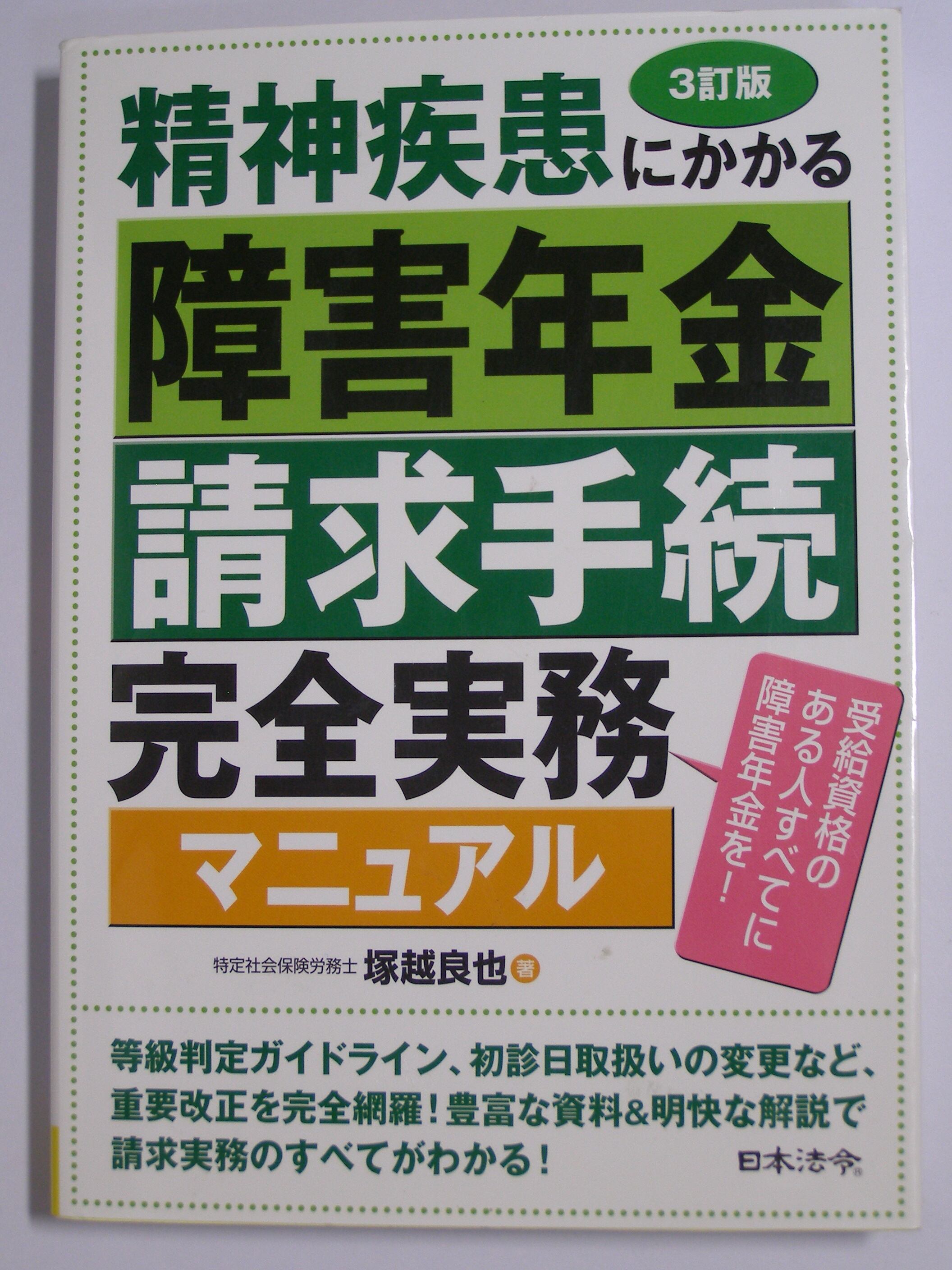 本の紹介:精神疾患に特化した障害年金請求手続のマニュアル本の3訂版。多数の障害年金案件に関わってきた著者が実際の請求手続の手順に沿って詳しく解説している。着実に重版を重ねており、2024年に5訂版が出ている。